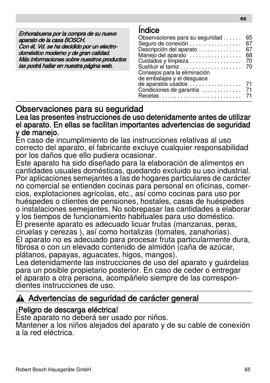 Seguro de conexión . . . . . . . . . . . . . . . . . Descripción del aparato . . . . . . . . . . . . . . Manejo del aparato . . . . . . . . . . . . . . . . . Cuidados y limpieza . . . . . . . . . . . . . . . . . Sustituir el tamiz . . . . . . . . . . . . . . . . . . . . Consejos para la eliminación de embalajes y el desguace de aparatos usados . . . . . . . . . . . . . . . . . Condiciones de garantía . . . . . . . . . . . . . Recetas . . . . . . . . . . . . . . . . . . . . . . . . . .