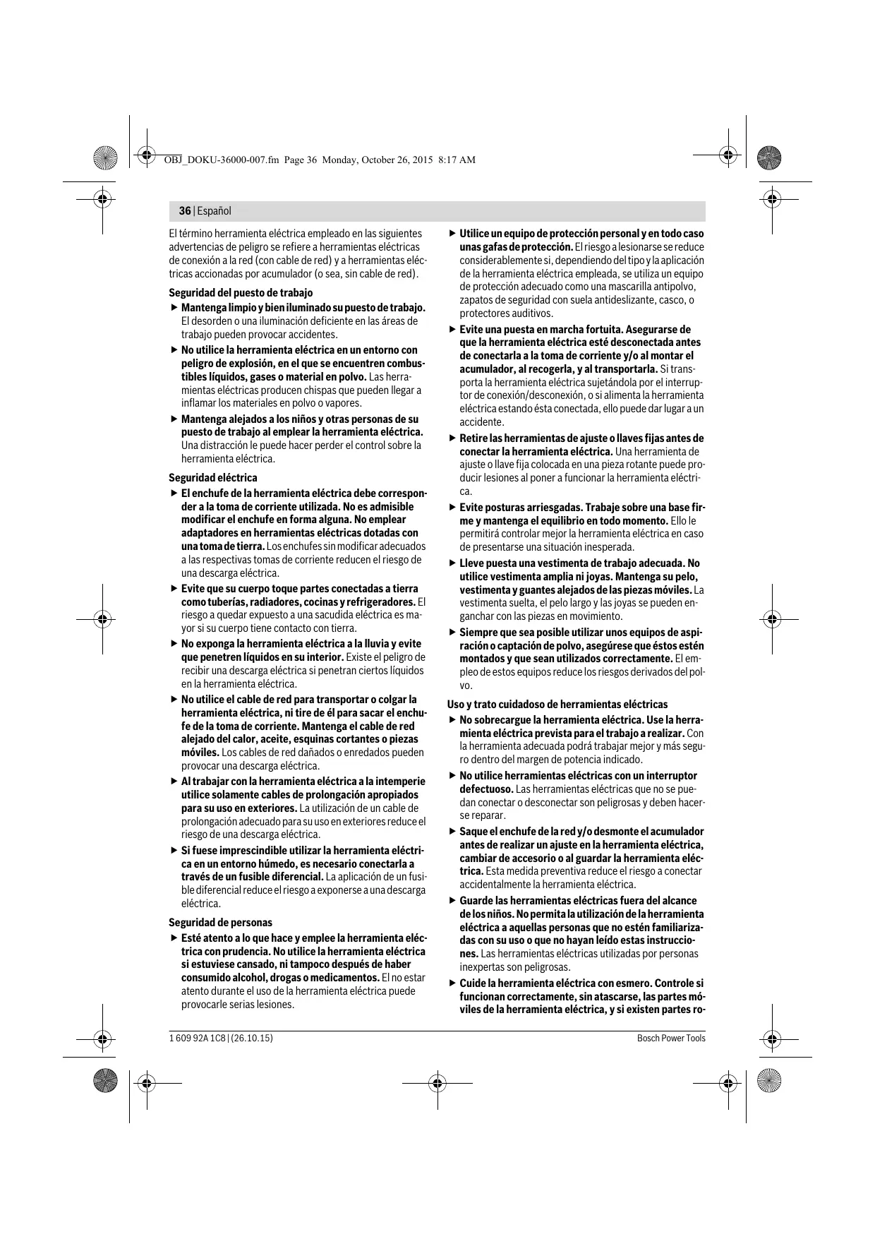 Español Instrucciones de seguridad Advertencias de peligro generales para herramientas eléctricas ADVERTENCIA Lea íntegramente estas advertencias de peligro e instrucciones. En caso de no atenerse a las advertencias de peligro e instrucciones siguientes, ello puede ocasionar una descarga eléctrica, un incendio y/o lesión grave. Guardar todas las advertencias de peligro e instrucciones para futuras consultas. 1 609 92A 1C8 | (26.10.15) 36 | Español El término herramienta eléctrica empleado en las siguientes advertencias de peligro se refiere a herramientas eléctricas de conexión a la red (con cable de red) y a herramientas eléctricas accionadas por acumulador (o sea, sin cable de red). Seguridad del puesto de trabajo Mantenga limpio y bien iluminado su puesto de trabajo. El desorden o una iluminación deficiente en las áreas de trabajo pueden provocar accidentes. No utilice la herramienta eléctrica en un entorno con peligro de explosión, en el que se encuentren combustibles líquidos, gases o material en polvo. Las herramientas eléctricas producen chispas que pueden llegar a inflamar los materiales en polvo o vapores. Mantenga alejados a los niños y otras personas de su puesto de trabajo al emplear la herramienta eléctrica. Una distracción le puede hacer perder el control sobre la herramienta eléctrica. Seguridad eléctrica El enchufe de la herramienta eléctrica debe corresponder a la toma de corriente utilizada. No es admisible modificar el enchufe en forma alguna. No emplear adaptadores en herramientas eléctricas dotadas con una toma de tierra. Los enchufes sin modificar adecuados a las respectivas tomas de corriente reducen el riesgo de una descarga eléctrica. Evite que su cuerpo toque partes conectadas a tierra como tuberías, radiadores, cocinas y refrigeradores. El riesgo a quedar expuesto a una sacudida eléctrica es mayor si su cuerpo tiene contacto con tierra. No exponga la herramienta eléctrica a la lluvia y evite que penetren líquidos en su interior. Existe el peligro de recibir una descarga eléctrica si penetran ciertos líquidos en la herramienta eléctrica. No utilice el cable de red para transportar o colgar la herramienta eléctrica, ni tire de él para sacar el enchufe de la toma de corriente. Mantenga el cable de red alejado del calor, aceite, esquinas cortantes o piezas móviles. Los cables de red dañados o enredados pueden provocar una descarga eléctrica. Al trabajar con la herramienta eléctrica a la intemperie utilice solamente cables de prolongación apropiados para su uso en exteriores. La utilización de un cable de prolongación adecuado para su uso en exteriores reduce el riesgo de una descarga eléctrica. Si fuese imprescindible utilizar la herramienta eléctrica en un entorno húmedo, es necesario conectarla a través de un fusible diferencial. La aplicación de un fusible diferencial reduce el riesgo a exponerse a una descarga eléctrica. Seguridad de personas Esté atento a lo que hace y emplee la herramienta eléctrica con prudencia. No utilice la herramienta eléctrica si estuviese cansado, ni tampoco después de haber consumido alcohol, drogas o medicamentos. El no estar atento durante el uso de la herramienta eléctrica puede provocarle serias lesiones. 1 609 92A 1C8 | (26.10.15) Utilice un equipo de protección personal y en todo caso unas gafas de protección. El riesgo a lesionarse se reduce considerablemente si, dependiendo del tipo y la aplicación de la herramienta eléctrica empleada, se utiliza un equipo de protección adecuado como una mascarilla antipolvo, zapatos de seguridad con suela antideslizante, casco, o protectores auditivos. Evite una puesta en marcha fortuita. Asegurarse de que la herramienta eléctrica esté desconectada antes de conectarla a la toma de corriente y/o al montar el acumulador, al recogerla, y al transportarla. Si transporta la herramienta eléctrica sujetándola por el interruptor de conexión/desconexión, o si alimenta la herramienta eléctrica estando ésta conectada, ello puede dar lugar a un accidente. Retire las herramientas de ajuste o llaves fijas antes de conectar la herramienta eléctrica. Una herramienta de ajuste o llave fija colocada en una pieza rotante puede producir lesiones al poner a funcionar la herramienta eléctrica. Evite posturas arriesgadas. Trabaje sobre una base firme y mantenga el equilibrio en todo momento. Ello le permitirá controlar mejor la herramienta eléctrica en caso de presentarse una situación inesperada. Lleve puesta una vestimenta de trabajo adecuada. No utilice vestimenta amplia ni joyas. Mantenga su pelo, vestimenta y guantes alejados de las piezas móviles. La vestimenta suelta, el pelo largo y las joyas se pueden enganchar con las piezas en movimiento. Siempre que sea posible utilizar unos equipos de aspiración o captación de polvo, asegúrese que éstos estén montados y que sean utilizados correctamente. El empleo de estos equipos reduce los riesgos derivados del polvo. Uso y trato cuidadoso de herramientas eléctricas No sobrecargue la herramienta eléctrica. Use la herramienta eléctrica prevista para el trabajo a realizar. Con la herramienta adecuada podrá trabajar mejor y más seguro dentro del margen de potencia indicado. No utilice herramientas eléctricas con un interruptor defectuoso. Las herramientas eléctricas que no se puedan conectar o desconectar son peligrosas y deben hacerse reparar. Saque el enchufe de la red y/o desmonte el acumulador antes de realizar un ajuste en la herramienta eléctrica, cambiar de accesorio o al guardar la herramienta eléctrica. Esta medida preventiva reduce el riesgo a conectar accidentalmente la herramienta eléctrica. Guarde las herramientas eléctricas fuera del alcance de los niños. No permita la utilización de la herramienta eléctrica a aquellas personas que no estén familiarizadas con su uso o que no hayan leído estas instrucciones. Las herramientas eléctricas utilizadas por personas inexpe