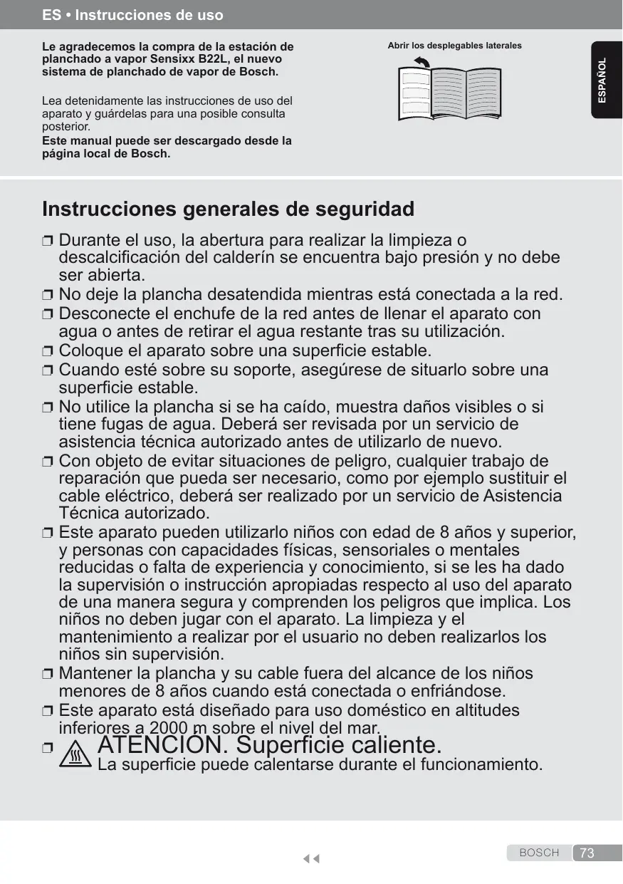ES • Instrucciones de uso Abrir los desplegables laterales Español Le agradecemos la compra de la estación de planchado a vapor Sensixx B22L, el nuevo sistema de planchado de vapor de Bosch. Lea detenidamente las instrucciones de uso del aparato y guárdelas para una posible consulta posterior. Este manual puede ser descargado desde la página local de Bosch. Instrucciones generales de seguridad ❐❐ Durante el uso, la abertura para realizar la limpieza o descalcificación del calderín se encuentra bajo presión y no debe ser abierta. ❐❐ No deje la plancha desatendida mientras está conectada a la red. ❐❐ Desconecte el enchufe de la red antes de llenar el aparato con agua o antes de retirar el agua restante tras su utilización. ❐❐ Coloque el aparato sobre una superficie estable. ❐❐ Cuando esté sobre su soporte, asegúrese de situarlo sobre una superficie estable. ❐❐ No utilice la plancha si se ha caído, muestra daños visibles o si tiene fugas de agua. Deberá ser revisada por un servicio de asistencia técnica autorizado antes de utilizarlo de nuevo. ❐❐ Con objeto de evitar situaciones de peligro, cualquier trabajo de reparación que pueda ser necesario, como por ejemplo sustituir el cable eléctrico, deberá ser realizado por un servicio de Asistencia Técnica autorizado. ❐❐ Este aparato pueden utilizarlo niños con edad de 8 años y superior, y personas con capacidades físicas, sensoriales o mentales reducidas o falta de experiencia y conocimiento, si se les ha dado la supervisión o instrucción apropiadas respecto al uso del aparato de una manera segura y comprenden los peligros que implica. Los niños no deben jugar con el aparato. La limpieza y el mantenimiento a realizar por el usuario no deben realizarlos los niños sin supervisión. ❐❐ Mantener la plancha y su cable fuera del alcance de los niños menores de 8 años cuando está conectada o enfriándose. ❐❐ Este aparato está diseñado para uso doméstico en altitudes inferiores a 2000 m sobre el nivel del mar.