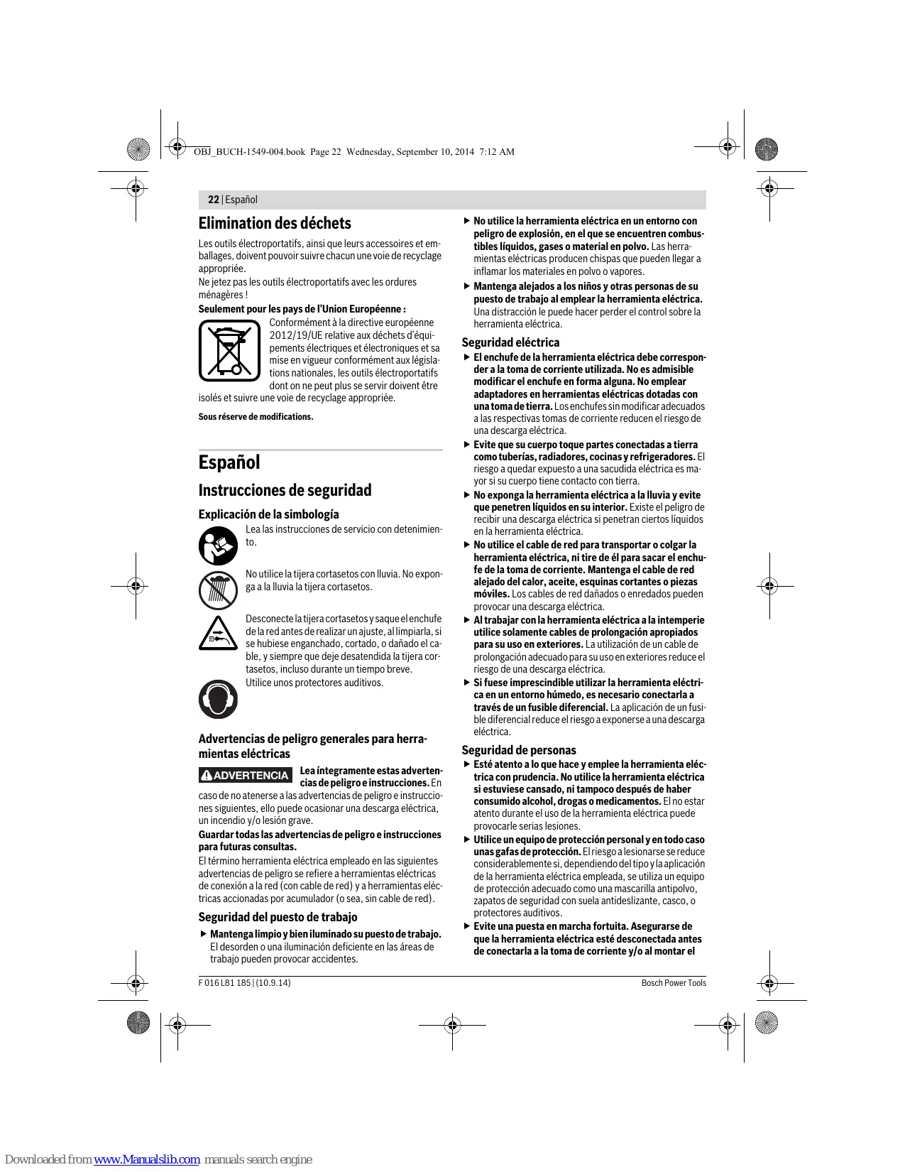 Español Instrucciones de seguridad Explicación de la simbología Lea las instrucciones de servicio con detenimiento. No utilice la tijera cortasetos con lluvia. No exponga a la lluvia la tijera cortasetos. Desconecte la tijera cortasetos y saque el enchufe de la red antes de realizar un ajuste, al limpiarla, si se hubiese enganchado, cortado, o dañado el cable, y siempre que deje desatendida la tijera cortasetos, incluso durante un tiempo breve. Utilice unos protectores auditivos. Advertencias de peligro generales para herramientas eléctricas ADVERTENCIA Lea íntegramente estas advertencias de peligro e instrucciones. En caso de no atenerse a las advertencias de peligro e instrucciones siguientes, ello puede ocasionar una descarga eléctrica, un incendio y/o lesión grave. Guardar todas las advertencias de peligro e instrucciones para futuras consultas. El término herramienta eléctrica empleado en las siguientes advertencias de peligro se refiere a herramientas eléctricas de conexión a la red (con cable de red) y a herramientas eléctricas accionadas por acumulador (o sea, sin cable de red). Seguridad del puesto de trabajo Mantenga limpio y bien iluminado su puesto de trabajo. El desorden o una iluminación deficiente en las áreas de trabajo pueden provocar accidentes. F 016 L81 185 | (10.9.14) No utilice la herramienta eléctrica en un entorno con peligro de explosión, en el que se encuentren combustibles líquidos, gases o material en polvo. Las herramientas eléctricas producen chispas que pueden llegar a inflamar los materiales en polvo o vapores. Mantenga alejados a los niños y otras personas de su puesto de trabajo al emplear la herramienta eléctrica. Una distracción le puede hacer perder el control sobre la herramienta eléctrica. Seguridad eléctrica El enchufe de la herramienta eléctrica debe corresponder a la toma de corriente utilizada. No es admisible modificar el enchufe en forma alguna. No emplear adaptadores en herramientas eléctricas dotadas con una toma de tierra. Los enchufes sin modificar adecuados a las respectivas tomas de corriente reducen el riesgo de una descarga eléctrica. Evite que su cuerpo toque partes conectadas a tierra como tuberías, radiadores, cocinas y refrigeradores. El riesgo a quedar expuesto a una sacudida eléctrica es mayor si su cuerpo tiene contacto con tierra. No exponga la herramienta eléctrica a la lluvia y evite que penetren líquidos en su interior. Existe el peligro de recibir una descarga eléctrica si penetran ciertos líquidos en la herramienta eléctrica. No utilice el cable de red para transportar o colgar la herramienta eléctrica, ni tire de él para sacar el enchufe de la toma de corriente. Mantenga el cable de red alejado del calor, aceite, esquinas cortantes o piezas móviles. Los cables de red dañados o enredados pueden provocar una descarga eléctrica. Al trabajar con la herramienta eléctrica a la intemperie utilice solamente cables de prolongación apropiados para su uso en exteriores. La utilización de un cable de prolongación adecuado para su uso en exteriores reduce el riesgo de una descarga eléctrica. Si fuese imprescindible utilizar la herramienta eléctrica en un entorno húmedo, es necesario conectarla a través de un fusible diferencial. La aplicación de un fusible diferencial reduce el riesgo a exponerse a una descarga eléctrica. Seguridad de personas Esté atento a lo que hace y emplee la herramienta eléctrica con prudencia. No utilice la herramienta eléctrica si estuviese cansado, ni tampoco después de haber consumido alcohol, drogas o medicamentos. El no estar atento durante el uso de la herramienta eléctrica puede provocarle serias lesiones. Utilice un equipo de protección personal y en todo caso unas gafas de protección. El riesgo a lesionarse se reduce considerablemente si, dependiendo del tipo y la aplicación de la herramienta eléctrica empleada, se utiliza un equipo de protección adecuado como una mascarilla antipolvo, zapatos de seguridad con suela antideslizante, casco, o protectores auditivos. Evite una puesta en marcha fortuita. Asegurarse de que la herramienta eléctrica esté desconectada antes de conectarla a la toma de corriente y/o al montar el Bosch Power Tools Español | 23 acumulador, al recogerla, y al transportarla. Si transporta la herramienta eléctrica sujetándola por el interruptor de conexión/desconexión, o si alimenta la herramienta eléctrica estando ésta conectada, ello puede dar lugar a un accidente. Retire las herramientas de ajuste o llaves fijas antes de conectar la herramienta eléctrica. Una herramienta de ajuste o llave fija colocada en una pieza rotante puede producir lesiones al poner a funcionar la herramienta eléctrica. Evite posturas arriesgadas. Trabaje sobre una base firme y mantenga el equilibrio en todo momento. Ello le permitirá controlar mejor la herramienta eléctrica en caso de presentarse una situación inesperada. Lleve puesta una vestimenta de trabajo adecuada. No utilice vestimenta amplia ni joyas. Mantenga su pelo, vestimenta y guantes alejados de las piezas móviles. La vestimenta suelta, el pelo largo y las joyas se pueden enganchar con las piezas en movimiento. Siempre que sea posible utilizar unos equipos de aspiración o captación de polvo, asegúrese que éstos estén montados y que sean utilizados correctamente. El empleo de estos equipos reduce los riesgos derivados del polvo. Uso y trato cuidadoso de herramientas eléctricas No sobrecargue la herramienta eléctrica. Use la herramienta eléctrica prevista para el trabajo a realizar. Con la herramienta adecuada podrá trabajar mejor y más seguro dentro del margen de potencia indicado. No utilice herramientas eléctricas con un interruptor defectuoso. Las herramientas eléctricas que no se puedan conectar o desconectar son peligrosas y deben hacerse reparar. Saque el enchufe de la red y/o desmonte el acumulador antes de realizar un ajuste en la herramienta eléctrica,