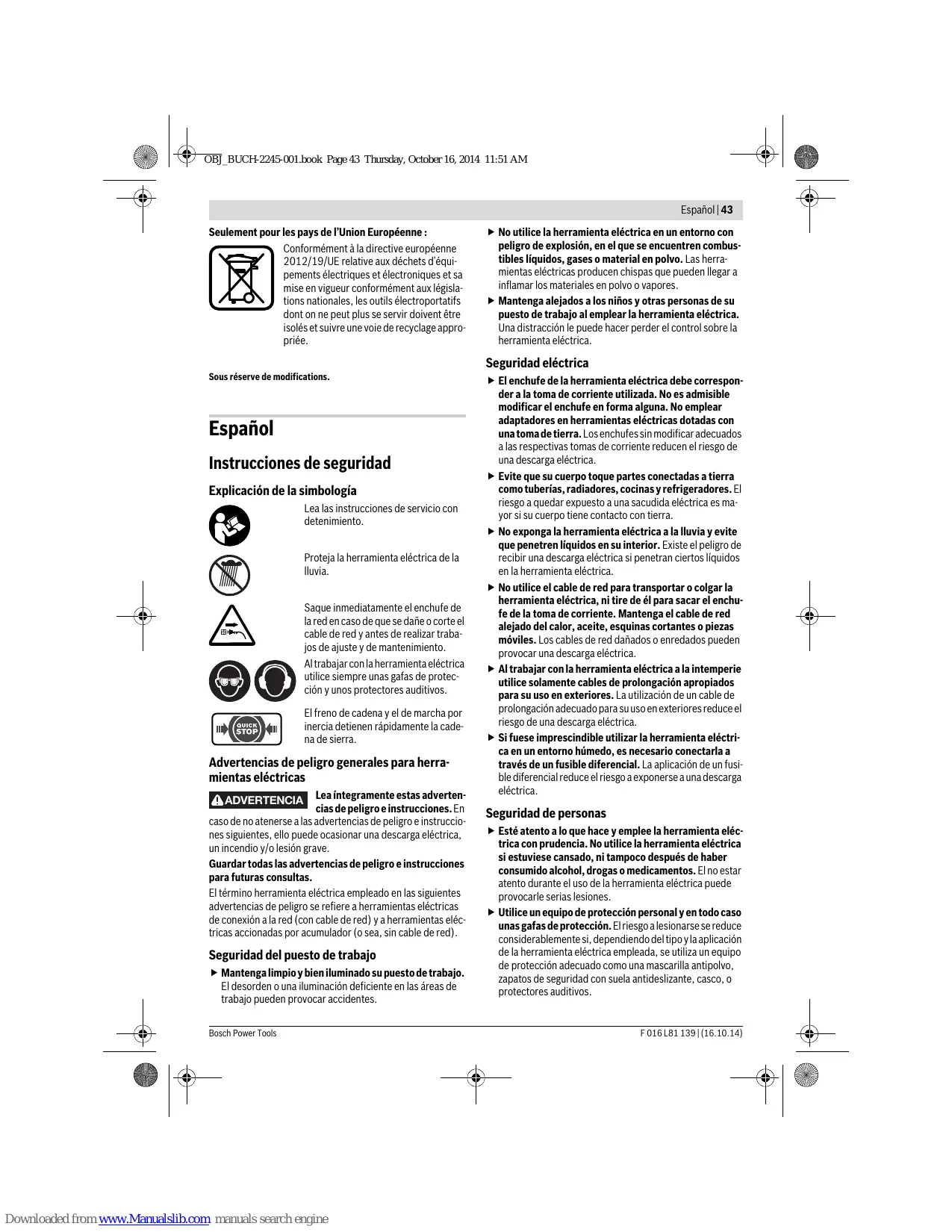 Recomendamos que las herramientas eléctricas, accesorios y embalajes sean sometidos a un proceso de recuperación que respete el medio ambiente. ¡No arroje las herramientas eléctricas a la basura! Sólo para los países de la UE: Conforme a la Directiva Europea 2012/19/UE sobre aparatos eléctricos y electrónicos inservibles, tras su transposición en ley nacional, deberán acumularse por separado las herramientas eléctricas para ser sometidas a un reciclaje ecológico. Reservado el derecho de modificación.