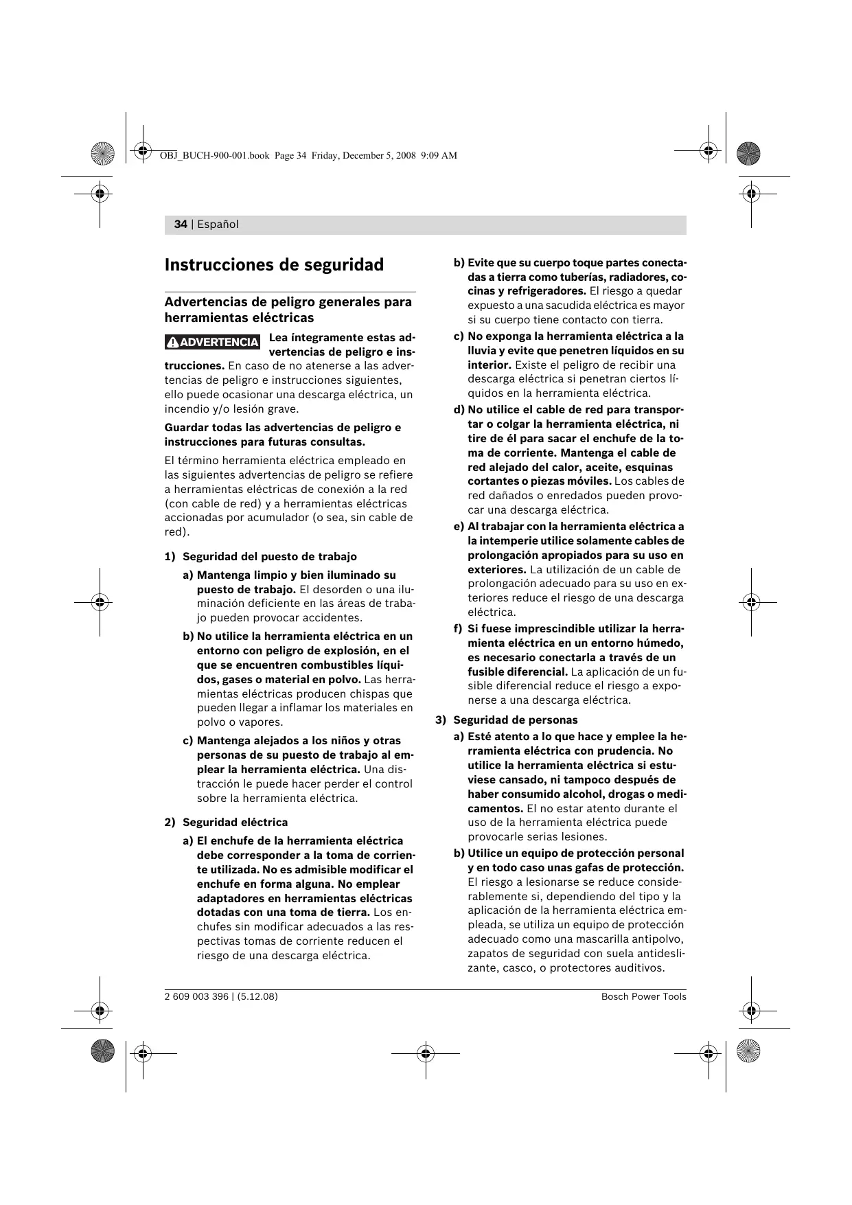 a) El enchufe de la herramienta eléctrica debe corresponder a la toma de corriente utilizada. No es admisible modificar el enchufe en forma alguna. No emplear adaptadores en herramientas eléctricas dotadas con una toma de tierra. Los enchufes sin modificar adecuados a las respectivas tomas de corriente reducen el riesgo de una descarga eléctrica. 2 609 003 396 | (5.12.08) b) Evite que su cuerpo toque partes conectadas a tierra como tuberías, radiadores, cocinas y refrigeradores. El riesgo a quedar expuesto a una sacudida eléctrica es mayor si su cuerpo tiene contacto con tierra. c) No exponga la herramienta eléctrica a la lluvia y evite que penetren líquidos en su interior. Existe el peligro de recibir una descarga eléctrica si penetran ciertos líquidos en la herramienta eléctrica. d) No utilice el cable de red para transportar o colgar la herramienta eléctrica, ni tire de él para sacar el enchufe de la toma de corriente. Mantenga el cable de red alejado del calor, aceite, esquinas cortantes o piezas móviles. Los cables de red dañados o enredados pueden provocar una descarga eléctrica. e) Al trabajar con la herramienta eléctrica a la intemperie utilice solamente cables de prolongación apropiados para su uso en exteriores. La utilización de un cable de prolongación adecuado para su uso en exteriores reduce el riesgo de una descarga eléctrica. f) Si fuese imprescindible utilizar la herramienta eléctrica en un entorno húmedo, es necesario conectarla a través de un fusible diferencial. La aplicación de un fusible diferencial reduce el riesgo a exponerse a una descarga eléctrica.