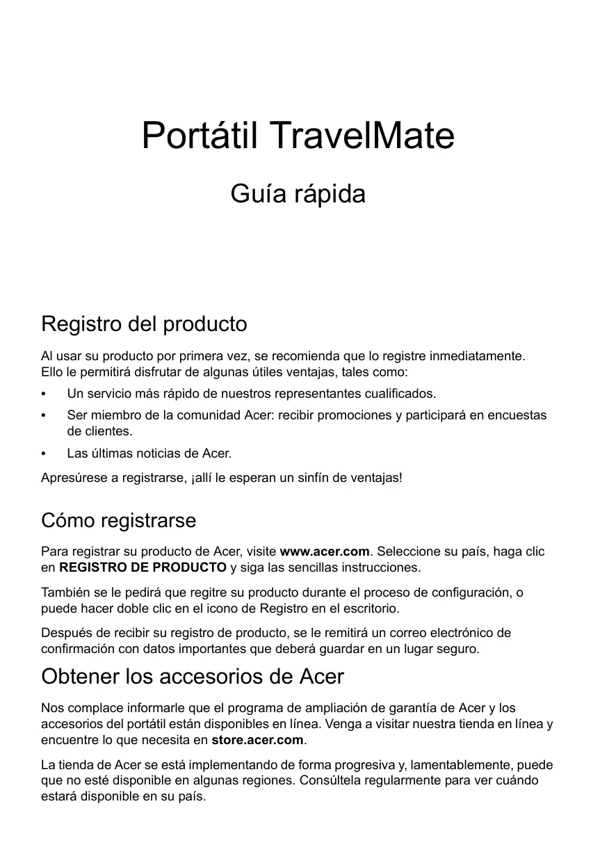 Para registrar su producto de Acer, visite www.acer.com. Seleccione su País, haga click en REGISTRO DE PRODUCTO y siga las vincillas instrucciones.