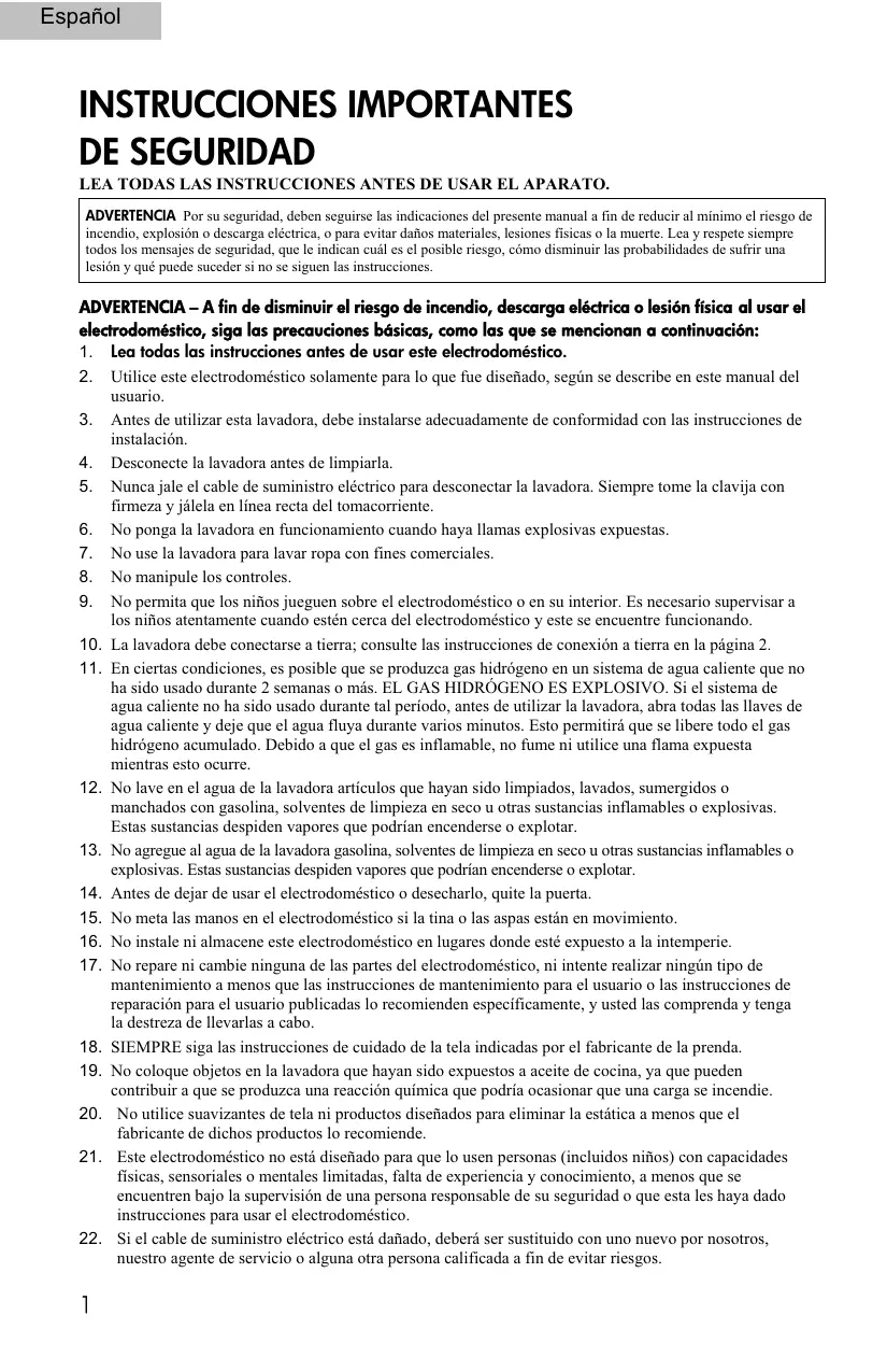 ha sido usado durante 2 semanas o más. EL GAS HIDRÓGENO ES EXPLOSIVO. Si el sistema de agua caliente no ha sido usado durante tal período, antes de utilizar la lavadora, abra todas las llaves de agua caliente y deje que el agua fluya durante varios minutos. Esto permitirá que se libere todo el gas hidrógeno acumulado. Debido a que el gas es inflamable, no fume ni utilice una flama expuesta mientras esto ocurre.