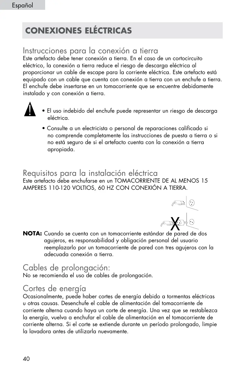 Nota: C uando se cuenta con un tomacorriente estándar de pared de dos agujeros, es responsabilidad y obligación personal del usuario reemplazarlo por un tomacorriente de pared con tres agujeros con la adecuada conexión a tierra. Cables de prolongación: No se recomienda el uso de cables de prolongación. Cortes de energía Ocasionalmente, puede haber cortes de energía debido a tormentas eléctricas u otras causas. Desenchufe el cable de alimentación del tomacorriente de corriente alterna cuando haya un corte de energía. Una vez que se restablezca la energía, vuelva a enchufar el cable de alimentación en el tomacorriente de corriente alterna. Si el corte se extiende durante un período prolongado, limpie la lavadora antes de utilizarla nuevamente.