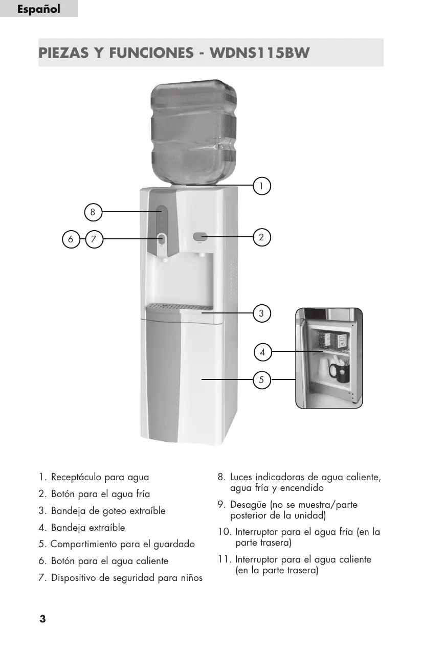 HOT HOT Español LUCES INDICADORAS DE AGUA FRÍA (VERDE) Y CALIENTE (ROJO) Cuando se iluminan las luces verde y roja en el frente de la unidad, están en funcionamiento los procesos de calentamiento y enfriamiento. Cuando el agua fría y caliente alcanzan las temperaturas adecuadas, las dos luces se apagan automáticamente. Normalmente, el agua caliente alcanza la temperatura adecuada primero. HOT WDNS115BW POWER HOT COLD WDNS32BW COOL
