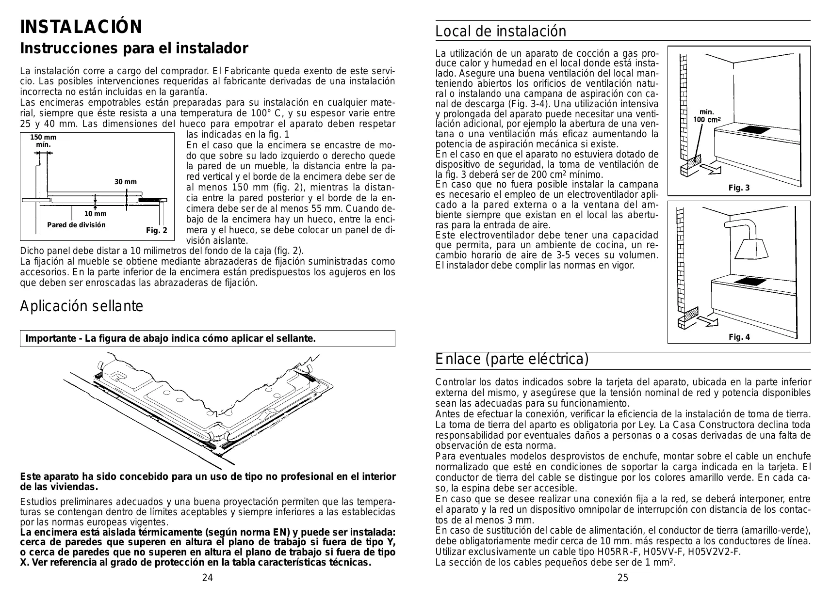 La realización de un aparato de coccción a gas produce calor y humedad en el local donde está instalado. Asegure una buena ventilación del local manteniendo abiertos los orificios de ventilación natural o instalando una campana de aspiración con canal de descarga (Fig. 3-4). Una realización intensiva y prolongada del aparato puedaunarisea una ventilación adicional, por exemple la abertura de una planta o una ventilación más eficaz augmentando la potencia de aspiración mecánica si existe.