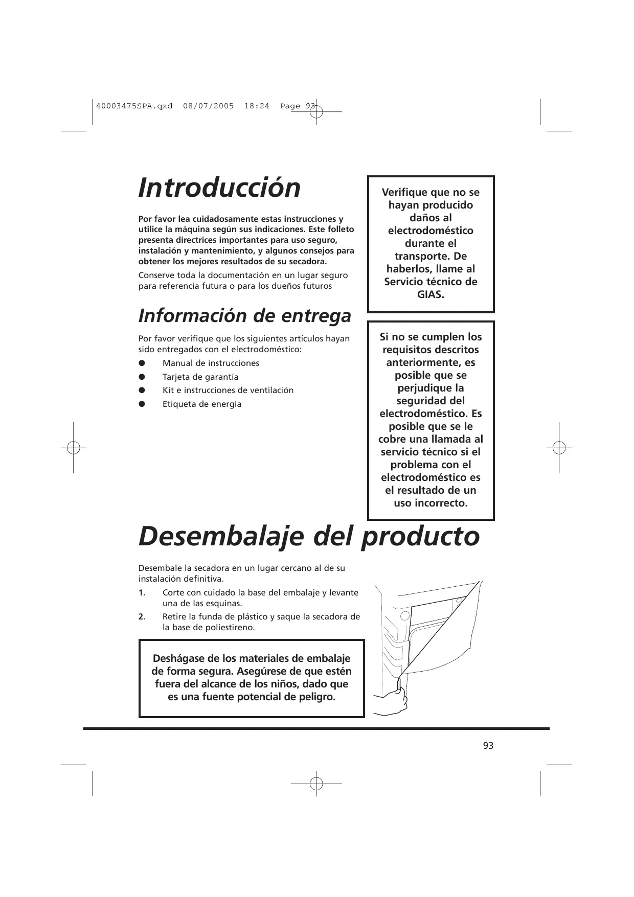 40003475SPA.qxd 08/07/2005 18:24 Page 93 Introducción Por favor lea cuidadosamente estas instrucciones y utilice la máquina según sus indicaciones. Este folleto presenta directrices importantes para uso seguro, instalación y mantenimiento, y algunos consejos para obtener los mejores resultados de su secadora. Conserve toda la documentación en un lugar seguro para referencia futura o para los dueños futuros Verifique que no se hayan producido daños al electrodoméstico durante el transporte. De haberlos, llame al Servicio técnico de GIAS. Información de entrega Por favor verifique que los siguientes artículos hayan sido entregados con el electrodoméstico: