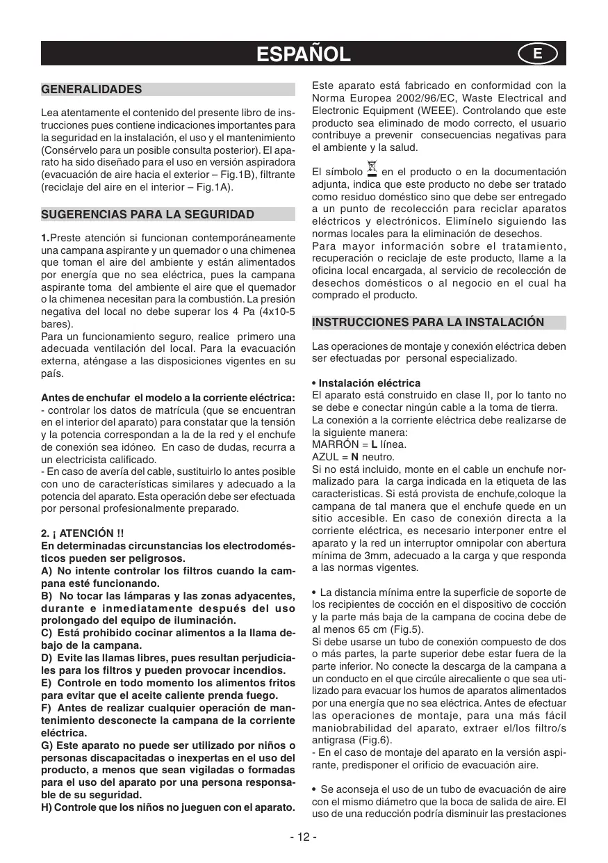 ESPAÑOL GENERALIDADES Lea atentamente el contenido del presente libro de instrucciones pues contiene indicaciones importantes para la seguridad en la instalación, el uso y el mantenimiento (Consérvelo para un posible consulta posterior). El aparato ha sido diseñado para el uso en versión aspiradora (evacuación de aire hacia el exterior – Fig.1B), filtrante (reciclaje del aire en el interior – Fig.1A).