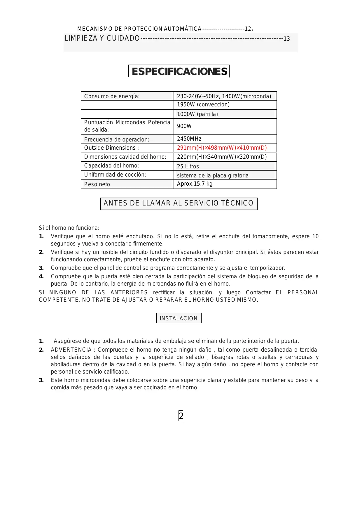 - ADVERTENCIA: Compruebe el hora no teng a ningun daño, tal como puerta desalineada o torcida, seslos dañados de las puertas y la superficie de sellado, bisagras rotas o sueltas y cerraduras y abolladuras bajo de la cavidad o en la puerta. Si hay algo daño, no opere el hora y contacte con personal de service calificado.