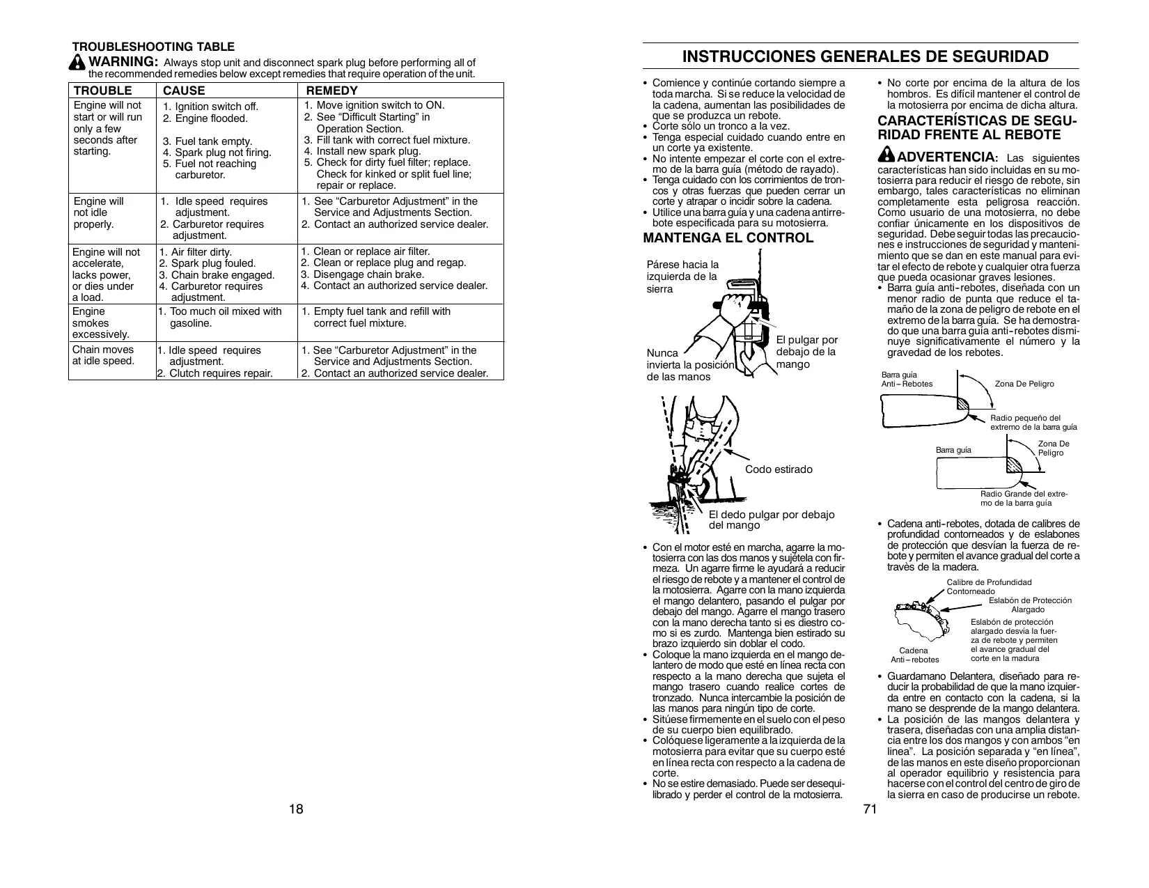 correct fuel mixture. Nunca invierta la posición de las manos El pulgar por debajo de la mango S No corte por encima de la altura de los hombros. Es difícil mantener el control de la motosierra por encima de dicha altura. CARACTERÍSTICAS DE SEGURIDAD FRENTE AL REBOTE ADVERTENCIA: Las siguientes características han sido incluidas en su motosierra para reducir el riesgo de rebote, sin embargo, tales características no eliminan completamente esta peligrosa reacción. Como usuario de una motosierra, no debe confiar únicamente en los dispositivos de seguridad. Debe seguir todas las precauciones e instrucciones de seguridad y mantenimiento que se dan en este manual para evitar el efecto de rebote y cualquier otra fuerza que pueda ocasionar graves lesiones. S Barra guía anti--rebotes, diseñada con un menor radio de punta que reduce el tamaño de la zona de peligro de rebote en el extremo de la barra guía. Se ha demostrado que una barra guía anti--rebotes disminuye significativamente el número y la gravedad de los rebotes. Barra guía Anti --- Rebotes Zona De Peligro Radio pequeño del extremo de la barra guía Barra guía Zona De Peligro Codo estirado El dedo pulgar por debajo del mango