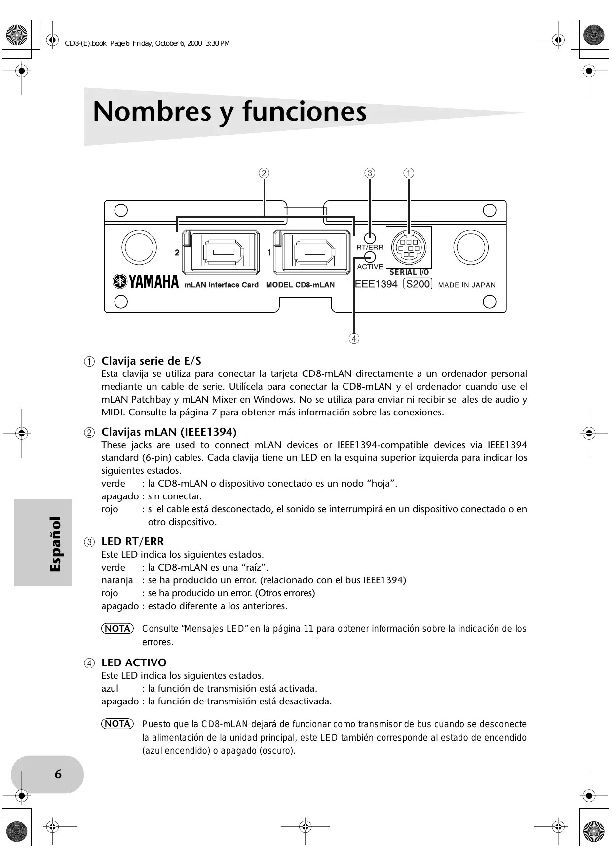 Este LED indica los siguientes estados. verde _: la CD8-mLAN es una “rafz”. naranja _: se ha producido un error. (relacionado con el bus IEEE1 394) rojo : se ha producido un error. (Otros errores) apagado : estado diferente a los anteriores. NOTA) Consulte “Mensajes LED"en la pâgina 11 para obtener informacién sobre la indicacién de los errores. LED ACTIVO Este LED indica los siguientes estados. azul : apagado : la funcién de transmisién esté activada. la funcién de transmisién esté desactivada. NOTA) Puesto que la CD8-mLAN dejaré de funcionar como transmisor de bus cuando se desconecte la alimentaciôn de la unidad principal, este LED también corresponde al estado de encendido (azul encendido) o apagado (oscuro).