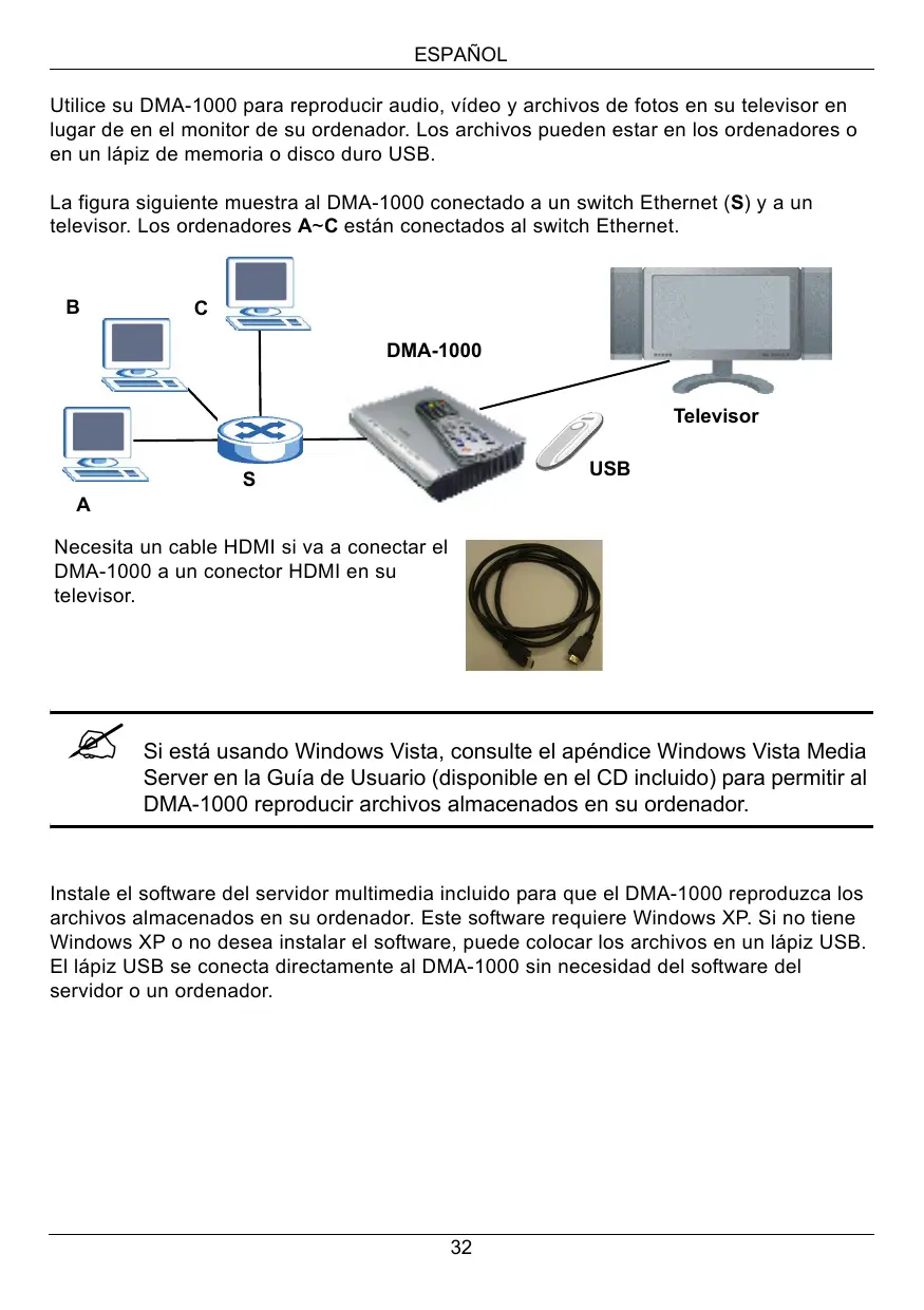 ESPAÑOL Utilice su DMA-1000 para reproducir audio, vídeo y archivos de fotos en su televisor en lugar de en el monitor de su ordenador. Los archivos pueden estar en los ordenadores o en un lápiz de memoria o disco duro USB. La figura siguiente muestra al DMA-1000 conectado a un switch Ethernet (S) y a un televisor. Los ordenadores A~C están conectados al switch Ethernet.
