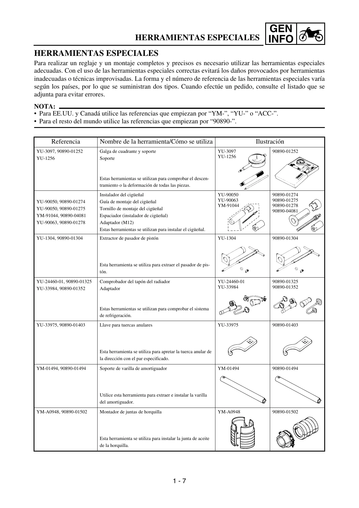 HERRAMIENTAS ESPECIALES Para realizar un reglaje y un montaje completos y precisos es necesario utilizar las herramientas especiales adecuadas. Con el uso de las herramientas especiales correctas evitará los daños provocados por herramientas inadecuadas o técnicas improvisadas. La forma y el número de referencia de las herramientas especiales varía según los países, por lo que se suministran dos tipos. Cuando efectúe un pedido, consulte el listado que se adjunta para evitar errores.