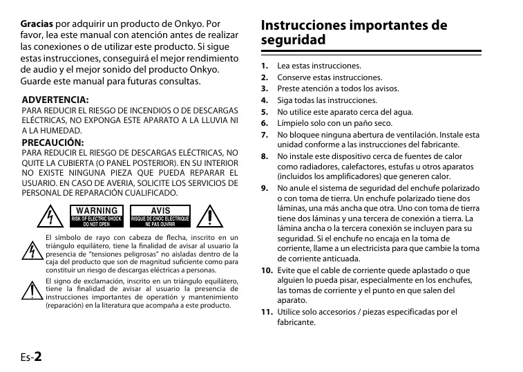Gracias por adquirir un producto de Onkyo. Por favor, lea este manual con atención antes de realizar las conexiones o de utilizar este producto. Si sigue estas instrucciones, conseguirá el mejor rendimiento de audio y el mejor sonido del producto Onkyo. Guarde este manual para futuras consultas. PRECAUCIÓN: PARA REDUCIR EL RIESGO DE DESCARGAS ELÉCTRICAS, NO QUITE LA CUBIERTA (O PANEL POSTERIOR). EN SU INTERIOR NO EXISTE NINGUNA PIEZA QUE PUEDA REPARAR EL USUARIO. EN CASO DE AVERIA, SOLICITE LOS SERVICIOS DE PERSONAL DE REPARACIÓN CUALIFICADO. WARNING AVIS El símbolo de rayo con cabeza de flecha, inscrito en un triángulo equilátero, tiene la finalidad de avisar al usuario la presencia de “tensiones peligrosas” no aisladas dentro de la caja del producto que son de magnitud suficiente como para constituir un riesgo de descargas eléctricas a personas. El signo de exclamación, inscrito en un triángulo equilátero, tiene la finalidad de avisar al usuario la presencia de instrucciones importantes de operatión y mantenimiento (reparación) en la literatura que acompaña a este producto. Es-2 Instrucciones importantes de seguridad