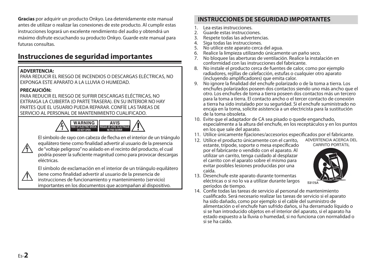 Guarde estas instrucciones. Respete todas las advertencias. Siga todas las instrucciones. No utilice este aparato cerca del agua. Realice la limpieza utilizando únicamente un paño seco. No bloquee las aberturas de ventilación. Realice la instalación en conformidad con las instrucciones del fabricante. No instale el producto cerca de fuentes de calor, como por ejemplo radiadores, rejillas de calefacción, estufas o cualquier otro aparato (incluyendo amplificadores) que emita calor. No ignore la finalidad del enchufe polarizado o de la toma a tierra. Los enchufes polarizados poseen dos contactos siendo uno más ancho que el otro. Los enchufes de toma a tierra poseen dos contactos más un tercero para la toma a tierra. El contacto ancho o el tercer contacto de conexión a tierra ha sido instalado por su seguridad. Si el enchufe suministrado no encaja en la toma, solicite asistencia a un electricista para la sustitución de la toma obsoleta. Evite que el adaptador de CA sea pisado o quede enganchado, especialmente a la altura del enchufe, en los receptáculos y en los puntos en los que sale del aparato. Utilice únicamente fijaciones/accesorios especificados por el fabricante. Utilice el producto únicamente con el carrito, ADVERTENCIA ACERCA DEL CARRITO PORTÁTIL estante, trípode, soporte o mesa especificado por el fabricante o vendido con el aparato. Al utilizar un carrito, tenga cuidado al desplazar el carrito con el aparato sobre el mismo para evitar posibles lesiones producidas por una caída. Desenchufe este aparato durante tormentas eléctricas o si no lo va a utilizar durante largos períodos de tiempo. Confíe todas las tareas de servicio al personal de mantenimiento cualificado. Será necesario realizar las tareas de servicio si el aparato ha sido dañado, como por ejemplo si el cable del suministro de alimentación o el enchufe han sufrido daños, si ha derramado líquido o si se han introducido objetos en el interior del aparato, si el aparato ha estado expuesto a la lluvia o humedad, si no funciona con normalidad o si se ha caído.