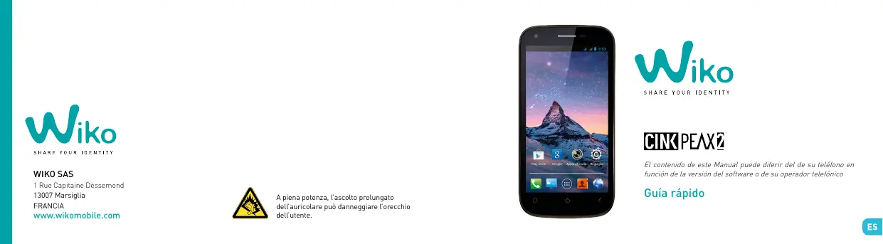 El contenido de este Manual puede diferir del de su teléfono en función de la versión del software o de su operador telefónico ¡ Enhorabuena ! Usted acaba de adquirir su teléfono móvil WIKO CINK PEAX2. En esta guía encontrará toda la información relativa a la utilización de este teléfono móvil para que, según es nuestro deseo, usted se familiarice rápidamente con el universo WIKO. Copyright © 2013 WIKO www.wikomobile.com La información contenida en el presente manual no podrá en ningún caso transmitirse, reproducirse o difundirse de forma alguna sin la autorización por escrito de WIKO. Marcas comerciales WIKO est une marque déposée de WIKO. Nota WIKO se reserva el derecho de modificar en cualquier mo- mento la información contenida en esta guía, la cual se ha elaborado con el mayor cuidado, si bien toda la información y recomendaciones que aquí constan no constituyen garantía alguna. Límite de la responsabilidad La integridad de los servicios y contenidos accesibles a través de este aparato son propiedad exclusiva de terceros, por lo que está protegida por la legislación (derecho de autor, patente, licencia, u otras leyes en materia de propiedad intelectual). Estos servicios se reservan al uso personal por parte del comprador y no para una utilización comercial. No se autoriza la utilización de dichos contenidos o servicios sin la autorización previa por escrito del propietario del contenido. El comprador en forma alguna podrá copiar, publicar, transferir, vender ni explotar en uno u otro soporte los contenidos o servicios editados por medio de este aparato, así como producir derivados de éstos. LOS SERVICIOS Y CONTENIDOS DE TERCEROS SE SU- MINISTRAN “TAL CUAL”. WIKO NO GARANTIZA LOS CONTENIDOS NI SERVICIOS ASÍ PRESTADOS, DE FORMA EXPRESA NI IMPLÍCITA, CUALQUIERA QUE SEA EL FIN DESEADO, ASÍ COMO LAS GARANTÍAS DE COMERCIABILIDAD Y ADECUACIÓN A UN USO PARTICULAR. WIKO NO GARANTIZA LA GARANTÍA DE EXACTITUD, VALIDEZ, LEGALIDAD O EXHAUSTIVIDAD DE LOS CONTENIDOS O SERVICIOS PRESTADOS POR ESTE APARATO. WIKO DECLINA TODA RESPONSABILIDAD EN CASO DE NEGLIGENCIA, TANTO A NIVEL DE RESPONSABILIDAD CONTRACTUAL O DELICTIVA, DE DAÑOS DIRECTOS O INDIRECTOS, FORTUITOS O ESPECIALES, DE HONORARIOS DE ABOGADOS, DE GASTOS O DE CUALQUIER OTRO PERJUICIO RESULTANTE DE LA UTILIZACIÓN DE LOS CONTENIDOS O SERVICIOS POR PARTE DEL COMPRADOR O POR TERCEROS INCLUSO SI SE HA INFORMADO A WIKO DE LA POSIBILIDAD DE