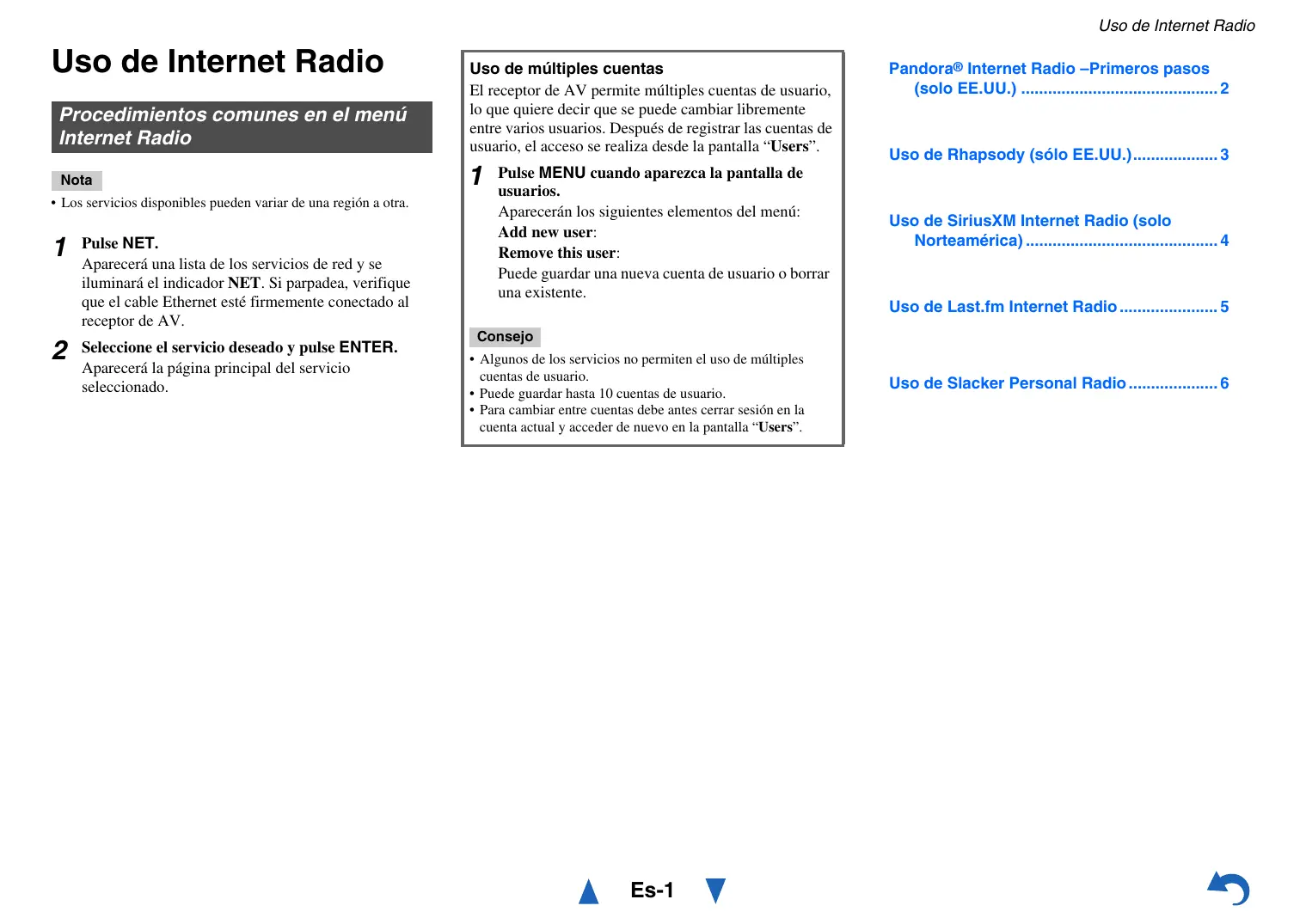 Pulse NET. Aparecerá una lista de los servicios de red y se iluminará el indicador NET. Si parpadea, verifique que el cable Ethernet esté firmemente conectado al receptor de AV. Seleccione el servicio deseado y pulse ENTER. Aparecerá la página principal del servicio seleccionado. Pulse MENU cuando aparezca la pantalla de usuarios. Aparecerán los siguientes elementos del menú: Add new user: Remove this user: Puede guardar una nueva cuenta de usuario o borrar una existente. Pandora® Internet Radio –Primeros pasos (solo EE.UU.) ............................................ 2 Uso de Rhapsody (sólo EE.UU.)................... 3 Consejo