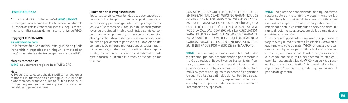 Appel en attente Guía de usuario WIKO SAS 1, rue Capitaine Dessemond 13007 Marsiglia FRANCIA www.wikomobile.com El contenido de esta guía podrá diferir del de tu teléfono en función de la versión del software o de tu operador telefónico ¡ ENHORABUENA ! Acabas de adquirir tu teléfono móvil WIKO LENNY2. En esta guía encontrarás toda la información relativa a la utilización de este teléfono móvil para que, según deseamos, te familiarices rápidamente con el universo WIKO. Copyright © 2015 WIKO es.wikomobile.com La información que contiene esta guía no se puede transmitir ni reproducir en ningún formato ni en ningún caso sin la autorización por escrito de WIKO. Marcas comerciales WIKO es una marca registrada de WIKO SAS . Nota WIKO se reserva el derecho de modificar en cualquier momento la información de esta guía, la cual se ha elaborado con el mayor cuidado, si bien toda la información y recomendaciones que aquí constan no constituyen garantía alguna. Limitación de la responsabilidad Todos los servicios y contenidos a los que puedes acceder desde este aparato son de propiedad exclusiva de terceros y por consiguiente están protegidos por las leyes (Derechos de Autor, patente, licencia y otras leyes de propiedad intelectual). Estos servicios son solo para su uso personal y no para un uso comercial. No es posible utilizar estos contenidos o servicios sin solicitarlo previamente por escrito al propietario del contenido. De ninguna manera puedes copiar, publicar, transferir, vender o explotar utilizando cualquier medio, los contenidos o servicios editados utilizando este aparato, ni producir formas derivadas de los mismos. LOS SERVICIOS Y CONTENIDOS DE TERCEROS SE ENTREGAN “TAL CUAL”. WIKO NO GARANTIZA LOS CONTENIDOS NI LOS SERVICIOS ASÍ ENTREGADOS, YA SEA DE MANERA EXPRESA O IMPLÍCITA, y SEA CUAL FUERE SU PROPÓSITO; NO GARANTIZA TAMPOCO LA CALIDAD COMERCIAL Y LA ADECUACIÓN PARA UN USO EN PARTICULAR. WIKO NO GARANTIZA LA EXACTITUD, LA VALIDEZ, LA LEGALIDAD NI LA
