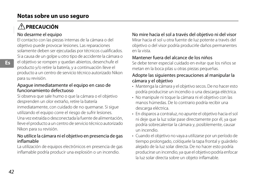 PRECAUCIÓN No desarme el equipo No mire hacia el sol a través del objetivo ni del visor El contacto con las piezas internas de la cámara o del objetivo puede provocar lesiones. Las reparaciones solamente deben ser ejecutadas por técnicos cualificados. Si a causa de un golpe u otro tipo de accidente la cámara o el objetivo se rompen y quedan abiertos, desenchufe el producto y/o retire la batería, y a continuación lleve el producto a un centro de servicio técnico autorizado Nikon para su revisión. Mirar hacia el sol u otra fuente de luz potente a través del objetivo o del visor podría producirle daños permanentes en la vista. Apague inmediatamente el equipo en caso de funcionamiento defectuoso