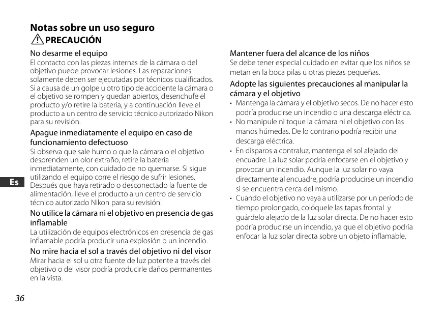 Notas sobre un uso seguro PRECAUCIÓN No desarme el equipo Mantener fuera del alcance de los niños El contacto con las piezas internas de la cámara o del objetivo puede provocar lesiones. Las reparaciones solamente deben ser ejecutadas por técnicos cualificados. Si a causa de un golpe u otro tipo de accidente la cámara o el objetivo se rompen y quedan abiertos, desenchufe el producto y/o retire la batería, y a continuación lleve el producto a un centro de servicio técnico autorizado Nikon para su revisión. Se debe tener especial cuidado en evitar que los niños se metan en la boca pilas u otras piezas pequeñas. Apague inmediatamente el equipo en caso de funcionamiento defectuoso Si observa que sale humo o que la cámara o el objetivo desprenden un olor extraño, retire la batería inmediatamente, con cuidado de no quemarse. Si sigue utilizando el equipo corre el riesgo de sufrir lesiones. Después que haya retirado o desconectado la fuente de alimentación, lleve el producto a un centro de servicio técnico autorizado Nikon para su revisión. No utilice la cámara ni el objetivo en presencia de gas inflamable La utilización de equipos electrónicos en presencia de gas inflamable podría producir una explosión o un incendio. No mire hacia el sol a través del objetivo ni del visor Mirar hacia el sol u otra fuente de luz potente a través del objetivo o del visor podría producirle daños permanentes en la vista. Adopte las siguientes precauciones al manipular la cámara y el objetivo
