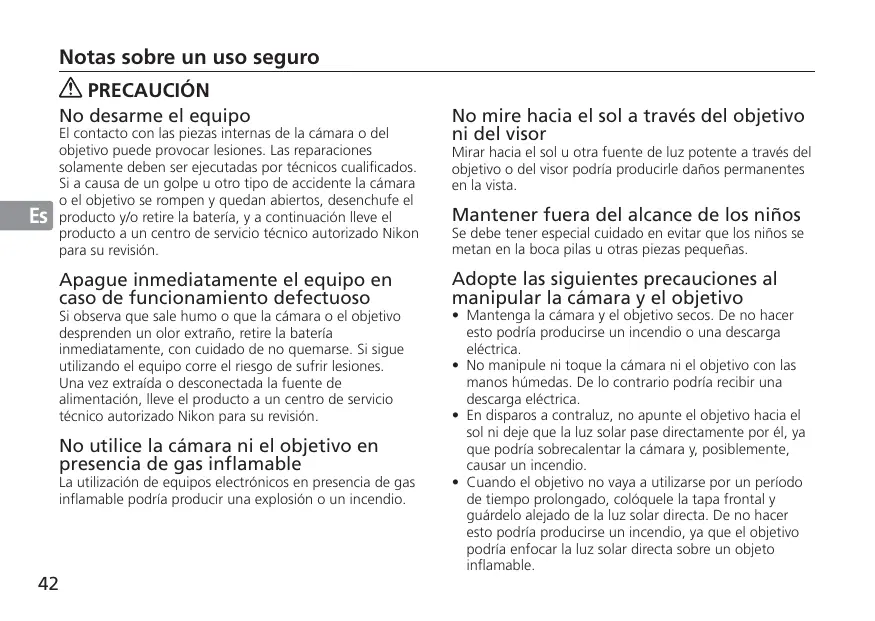 PRECAUCIÓN No desarme el equipo El contacto con las piezas internas de la cámara o del objetivo puede provocar lesiones. Las reparaciones solamente deben ser ejecutadas por técnicos cualificados. Si a causa de un golpe u otro tipo de accidente la cámara o el objetivo se rompen y quedan abiertos, desenchufe el producto y/o retire la batería, y a continuación lleve el producto a un centro de servicio técnico autorizado Nikon para su revisión.