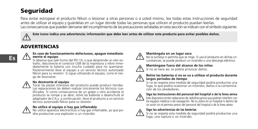 Si observa que sale humo del PD-10, o que desprende un olor extraño, desconecte el conector USB de la impresora y retire inmediatamente la batería con mucho cuidado para no quemarse. Posteriormente lleve el equipo a un servicio técnico autorizado Nikon para su revisión. Si sigue utilizando el equipo, corre el riesgo de lesionarse. No desmonte el equipo Tocar las piezas interiores del producto puede producir heridas. Las reparaciones las deben realizar únicamente los técnicos cualificados. Si como consecuencia de un golpe u otro accidente el producto se rompe y se abre, retire las baterías o desenchufe el adaptador de CA y, a continuación, lleve el producto a un servicio técnico autorizado Nikon para su revisión. No utilice el equipo si hay gas inflamable No utilice aparatos electrónicos si hay gas inflamable, ya que podría producirse una explosión o un incendio.