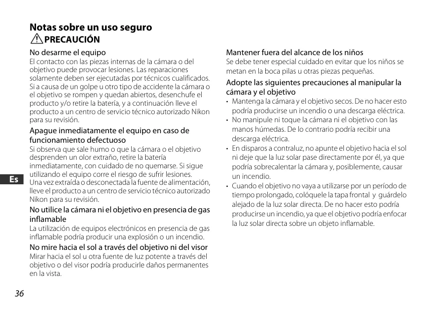 Apague inmediatamente el equipo en caso de funcionamiento defectuoso Si observa que sale humo o que la cámara o el objetivo desprenden un olor extraño, retire la batería inmediatamente, con cuidado de no quemarse. Si sigue utilizando el equipo corre el riesgo de sufrir lesiones. Una vez extraída o desconectada la fuente de alimentación, lleve el producto a un centro de servicio técnico autorizado Nikon para su revisión.