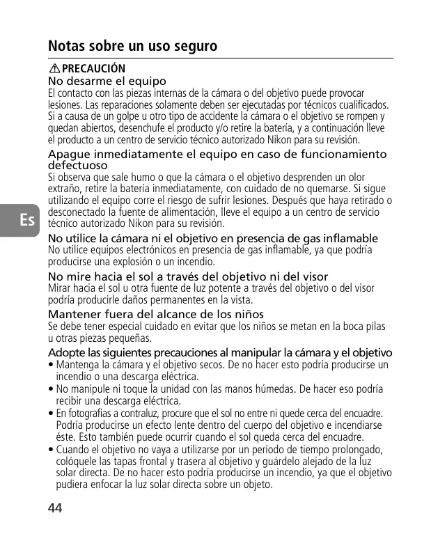 El contacto con las piezas internas de la cámara o del objetivo puede provocar lesiones. Las reparaciones solamente deben ser ejecutadas por técnicos cualificados. Si a causa de un golpe u otro tipo de accidente la cámara o el objetivo se rompen y quedan abiertos, desenchufe el producto y/o retire la batería, y a continuación lleve el producto a un centro de servicio técnico autorizado Nikon para su revisión. Apague inmediatamente el equipo en caso de funcionamiento defectuoso Si observa que sale humo o que la cámara o el objetivo desprenden un olor extraño, retire la batería inmediatamente, con cuidado de no quemarse. Si sigue utilizando el equipo corre el riesgo de sufrir lesiones. Después que haya retirado o desconectado la fuente de alimentación, lleve el equipo a un centro de servicio técnico autorizado Nikon para su revisión. No utilice la cámara ni el objetivo en presencia de gas inflamable No utilice equipos electrónicos en presencia de gas inflamable, ya que podría producirse una explosión o un incendio. No mire hacia el sol a través del objetivo ni del visor Mirar hacia el sol u otra fuente de luz potente a través del objetivo o del visor podría producirle daños permanentes en la vista. Mantener fuera del alcance de los niños Se debe tener especial cuidado en evitar que los niños se metan en la boca pilas u otras piezas pequeñas. Adopte las siguientes precauciones al manipular la cámara y el objetivo • Mantenga la cámara y el objetivo secos. De no hacer esto podría producirse un incendio o una descarga eléctrica. • No manipule ni toque la unidad con las manos húmedas. De hacer eso podría recibir una descarga eléctrica. • En fotografías a contraluz, procure que el sol no entre ni quede cerca del encuadre. Podría producirse un efecto lente dentro del cuerpo del objetivo e incendiarse éste. Esto también puede ocurrir cuando el sol queda cerca del encuadre. • Cuando el objetivo no vaya a utilizarse por un período de tiempo prolongado, colóquele las tapas frontal y trasera al objetivo y guárdelo alejado de la luz solar directa. De no hacer esto podría producirse un incendio, ya que el objetivo pudiera enfocar la luz solar directa sobre un objeto.