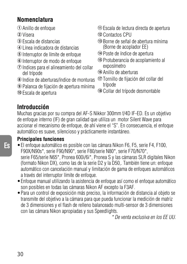 Muchas gracias por su compra del AF-S Nikkor 300mm f/4D IF-ED. Es un objetivo de enfoque interno (IF) de gran calidad que utiliza un motor Silent Wave para accionar el mecanismo de enfoque, de ahí viene el “S”. En consecuencia, el enfoque automático es suave, silencioso y prácticamente instantáneo. Principales funciones •El enfoque automático es posible con las cámara Nikon F6, F5, serie F4, F100, F90X/N90s*, serie F90/N90*, serie F80/serie N80*, serie F70/N70*, serie F65/serie N65*, Pronea 600i/6i*, Pronea S y las cámaras SLR digitales Nikon (formato Nikon DX), como las de la serie D2 y la D50,. También tiene un: enfoque automático con cancelación manual y limitación de gama de enfoques automáticos a través del interruptor límite de enfoque. •Enfoque manual utilizando la asistencia de enfoque así como el enfoque automático son posibles en todas las cámaras Nikon AF excepto la F3AF. •Para un control de exposición más preciso, la información de distancia al objeto se transmite del objetivo a la cámara para que pueda funcionar la medición de matriz de 3 dimensiones y el flash de relleno balanceado multi-sensor de 3 dimensiones con las cámara Nikon apropiadas y sus Speedlights. * De venta exclusiva en los EE UU.