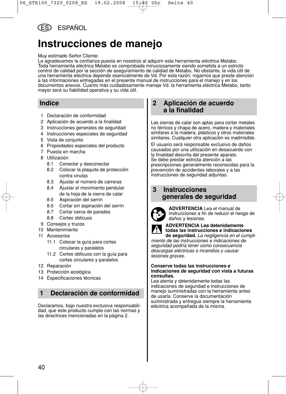 Instrucciones de manejo Muy estimado Señor Cliente: Le agradecemos la confianza puesta en nosotros al adquirir esta herramienta eléctrica Metabo. Toda herramienta eléctrica Metabo es comprobada minuciosamente siendo sometida a un estricto control de calidad por la sección de aseguramiento de calidad de Metabo. No obstante, la vida útil de una herramienta eléctrica depende esencialmente de Vd. Por esta razón, rogamos que preste atención a las informaciones entregadas en el presente manual de instrucciones para el manejo y en los documentos anexos. Cuanto más cuidadosamente maneje Vd. la herramienta eléctrica Metabo, tanto mayor será su fiabilidad operativa y su vida útil. Indice