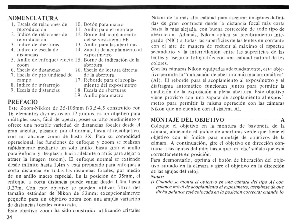 PREFACIO Este Zoom-Nikkor de 35-105mm f/3,5-4,5 construido con 16 elementos dispuestos en 12 grupos, es un objetivo para multiples usos, facil de operar, posee un alto rendimiento y ofrece una notable variedad de distancias focales desde el gran angular, pasando por el normal, hasta el teleobjetivo, con un alcance zoom de hasta 3X. Para su comodidad operacional, las funciones de enfoque y zoom se realizan rafMdamente mediante un solo anillo; basta girar el anillo para enfocar y desplazar hacia adelante o atras para alejar o atraer la imagen (zoom). El enfoque normal se extiende desde infinito hasta 1,4m y esta preparado para enfoques a corta distancia en todas las distancias focales, por medio de un anillo macro especial. En la posicion de 35mm, el enfoque a corta distancia puede variar desde 1,4m hasta 0,27m. Con este objetivo se pueden utilizar filtros del tamano estandar de Nikon de 52mm; excepcionalmente pequefio para un objetivo zoom con una amplia variation de distancias focales como este. Este objetivo zoom ha sido construido utilizando cristales 24