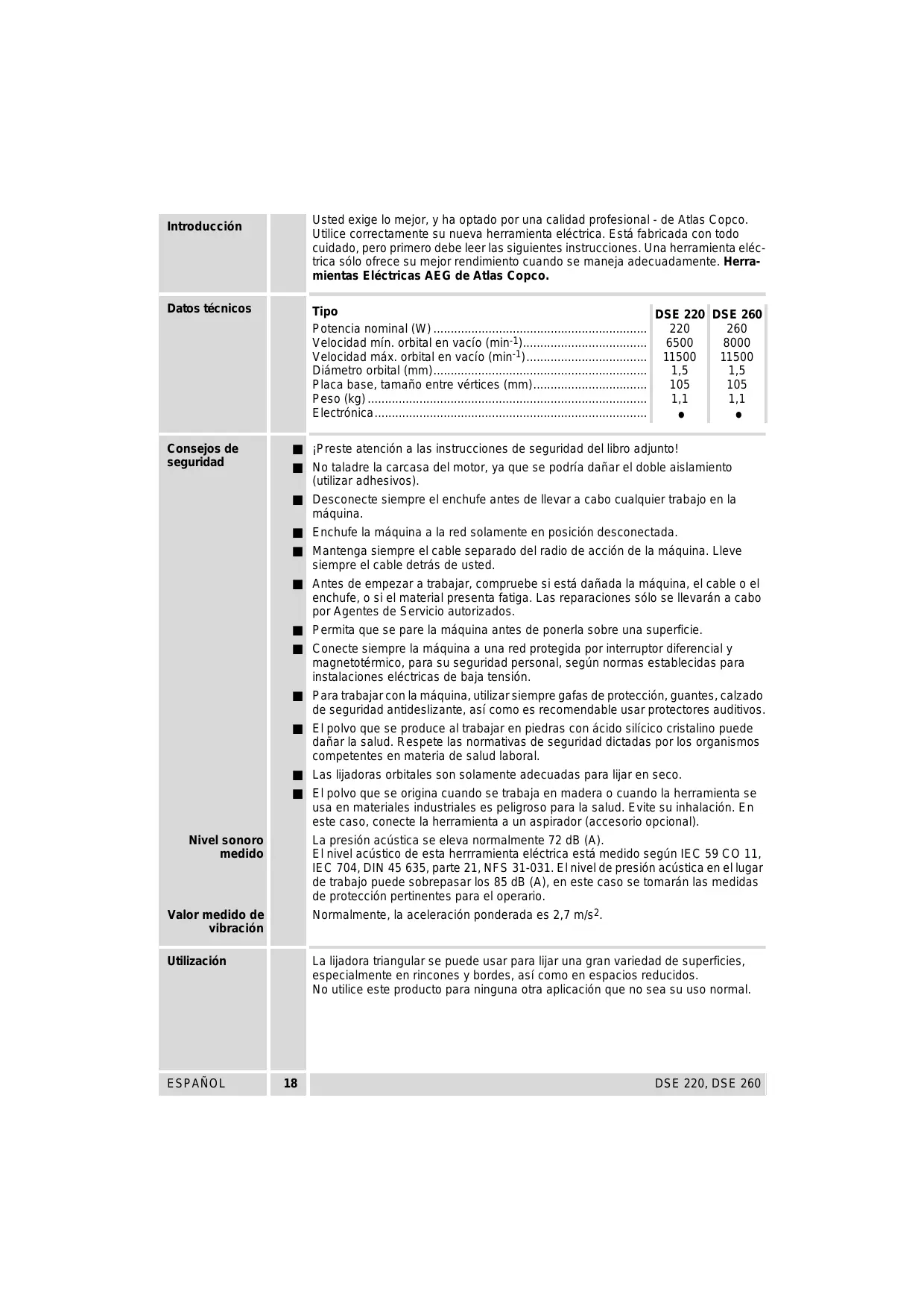 Usted exige lo mejor, y ha optado por una calidad profesional - de Atlas Copco. Utlice correctamente su nueva herramienta eléctrica. Esté fabricada con todo cuidado, pero primero debe leer las siguientes instrucciones. Una herramienta eléc- trica sélo ofrece su mejor rendimiento cuando se maneja adecuadamente. Herra- mientas Eléctricas AEG de Atlas Copco. Tipo DSE 220 DSE 260 Potencia nominal (W)… 220 260 Velocidad min. orbital en vacio (min-1). 6500 | 8000 Velocidad mäx. orbital en vacio (mini) 11500 11500 Diémetro orbital (mm). 1,5 1,5 Placa base, tamaño entre vértices (mm). 105 105 Peso (kg)... 11 11 Electrénica.…… . . iPreste atenciôn a las instrucciones de seguridad del libro adjunto! No taladre la carcasa del motor, ya que se podria dañar el doble aislamiento {utilizar adhesivos) Desconecte siempre el enchufe antes de Ilevar a cabo cualquier trabajo en la méquina. Enchufe la mäquina a la red solamente en posicién desconectada Mantenga siempre el cable separado del radio de acciôn de la méquina. Lieve siempre el cable detrés de usted. Antes de empezar a trabajar, compruebe si esté dañada la méquina, el cable o el enchufe, o si el material presenta fatiga. Las reparaciones sélo se llevarän a cabo por Agentes de Servicio autorizados. Permita que se pare la méquina antes de ponerla sobre una superficie. Conecte siempre la méquina à una red protegida por interruptor diferencial y magnetotérmico, para su seguridad personal, segün normas establecidas para instalaciones elécticas de baja tensiôn. Para trabajar con la méquina, utilizar siempre gafas de protecciôn, guantes, calzado de seguridad antideslizante, asi como es recomendable usar protectores auditivos. El polvo que se produce al trabajar en piedras con écido silicico cristalino puede dañr la salud. Respete las normativas de seguridad dictadas por los organismos competentes en materia de salud laboral. Las lijadoras orbitales son solamente adecuadas para ljar en seco. El polo que se origina cuando se trabaja en madera o cuando la herramienta se usa en materiales industriales es peligroso para la salud. Evite su inhalaciôn. En este caso, conecte la herramienta à un aspirador (accesorio opcional). La presién acüstica se eleva normalmente 72 dB (A) El nivel acüstico de esta herrramienta eléctrica esta medido segün IEC 59 CO 11, IEC 704, DIN 45 635, parte 21, NFS 31-031. El nivel de presiôn acüstica en el lugar de trabajo puede sobrepasar los 85 dB (A), en este caso se tomarän las medidas de protecciôn pertinentes para el operario. Normalmente, la aceleraciôn ponderada es 2,7 m/s2. La ljadora triangular se puede usar para lijar una gran variedad de superficies, especialmente en rincones y bordes, asi como en espacios reducidos. No utlice este producto para ninguna otra aplicaciôn que no sea su uso normal. DSE 220, DSE 260