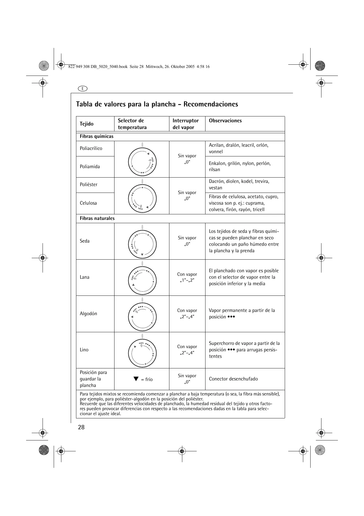 Tabla de valores para la plancha - Recomendaciones Tejido Selector de temperatura Fibras de celulosa, acetato, cupro, viscosa son p. ej.: cuprama, colvera, firón, rayón, tricell Fibras naturales Seda Sin vapor „0“ Los tejidos de seda y fibras químicas se pueden planchar en seco colocando un paño húmedo entre la plancha y la prenda Lana El planchado con vapor es posible con el selector de vapor entre la posición inferior y la media Algodón Vapor permanente a partir de la posición ••• Lino Superchorro de vapor a partir de la posición ••• para arrugas persistentes Sin vapor „0“ Conector desenchufado Posición para guardar la plancha = frío Para tejidos mixtos se recomienda comenzar a planchar a baja temperatura (o sea, la fibra más sensible), por ejemplo, para poliéster-algodón en la posición del poliéster. Recuerde que las diferentes velocidades de planchado, la humedad residual del tejido y otros factores pueden provocar diferencias con respecto a las recomendaciones dadas en la tabla para seleccionar el ajuste ideal.
