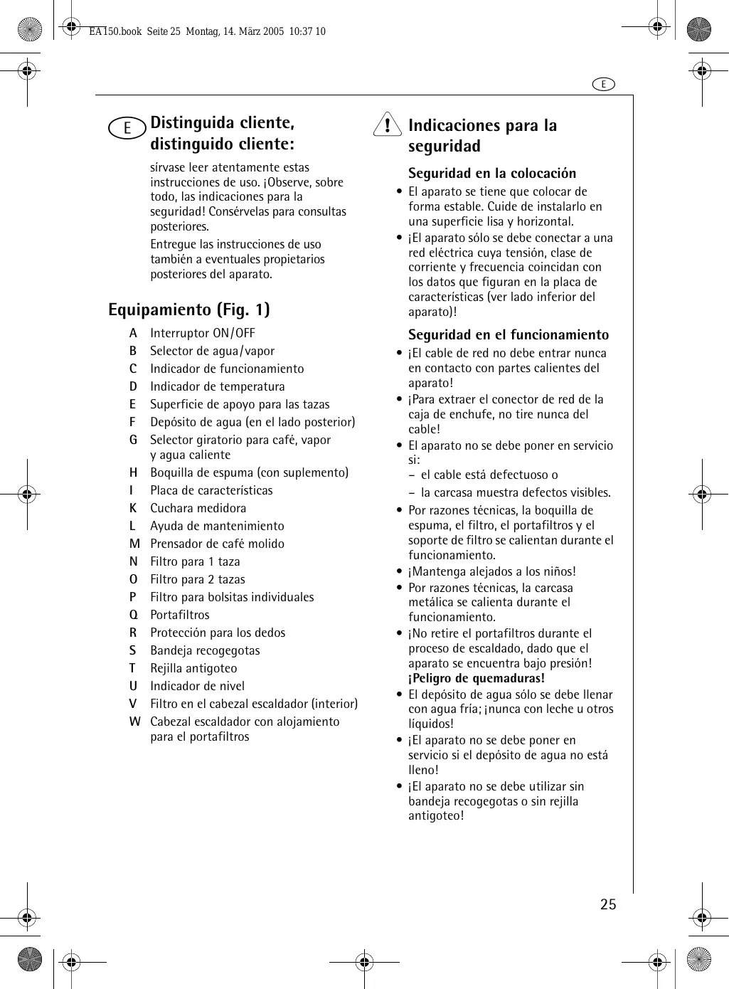 - No retire el portafiltres durante el proceso de escaldado, dato que el aparato se encontrartra bajo presión! Peligro de quemaduras!