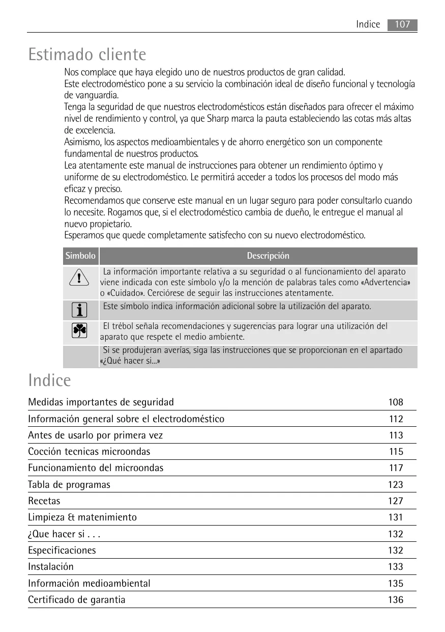 Indice Estimado cliente Nos complace que haya elegido uno de nuestros productos de gran calidad. Este electrodoméstico pone a su servicio la combinaciôn ideal de diseño funcional y tecnologia de vanguardia. Tenga la seguridad de que nuestros electrodomésticos estän diseñados para ofrecer el mäximo nivel de rendimiento y control, ya que Sharp marca la pauta estableciendo las cotas ms altas de excelencia. Asimismo, los aspectos medioambientales y de ahorro energético son un componente fundamental de nuestros productos. Lea atentamente este manual de instrucciones para obtener un rendimiento 6ptimo y uniforme de su electrodoméstico. Le permitirä acceder a todos los procesos del modo mäs eficaz y preciso. Recomendamos que conserve este manual en un lugar seguro para poder consultarlo cuando lo necesite. Rogamos que, si el electrodoméstico cambia de dueño, le entregue el manual al nuevo propietario. Esperamos que quede completamente satisfecho con su nuevo electrodoméstico. La informaciôn importante relativa a su seguridad o al funcionamiento del aparato viene indicada con este simbolo y/o la menciôn de palabras tales como «Advertencia» 0 «Cuidador. Cerciérese de seguir las instrucciones atentamente. Ü Este simbolo indica informaciôn adicional sobre la utilizaciôn del aparato. El trébol señala recomendaciones y sugerencias para lograr una utilizaciôn del aparato que respete el medio ambiente. Si se produjeran averias, siga las instrucciones que se proporcionan en el apartado «Qué hacer si.» Indice Medidas importantes de seguridad 108 Informaciôn general sobre el electrodoméstico 112 Antes de usarlo por primera vez 13 Cocciôn tecnicas microondas 115 Funcionamiento del microondas 117 Tabla de programas 123 Recetas 127 Limpieza & matenimiento 131 éQue hacer si... 132 Especificaciones 132 Instalaciôn 133 Informaciôn medioambiental 135 Certificado de garantia 136