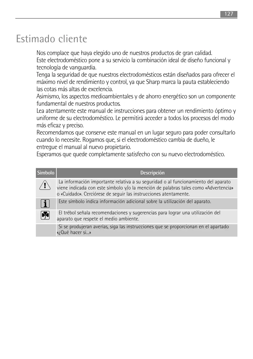 Estimado cliente Nos complace que haya elegido uno de nuestros productos de gran calidad. Este electrodoméstico pone a su servicio la combinación ideal de diseño funcional y tecnología de vanguardia. Tenga la seguridad de que nuestros electrodomésticos están diseñados para ofrecer el máximo nivel de rendimiento y control, ya que Sharp marca la pauta estableciendo las cotas más altas de excelencia. Asimismo, los aspectos medioambientales y de ahorro energético son un componente fundamental de nuestros productos. Lea atentamente este manual de instrucciones para obtener un rendimiento óptimo y uniforme de su electrodoméstico. Le permitirá acceder a todos los procesos del modo más eficaz y preciso. Recomendamos que conserve este manual en un lugar seguro para poder consultarlo cuando lo necesite. Rogamos que, si el electrodoméstico cambia de dueño, le entregue el manual al nuevo propietario. Esperamos que quede completamente satisfecho con su nuevo electrodoméstico. Simbolo Descripción La información importante relativa a su seguridad o al funcionamiento del aparato viene indicada con este símbolo y/o la mención de palabras tales como «Advertencia» o «Cuidado». Cerciórese de seguir las instrucciones atentamente. Este símbolo indica información adicional sobre la utilización del aparato. El trébol señala recomendaciones y sugerencias para lograr una utilización del aparato que respete el medio ambiente. Si se produjeran averías, siga las instrucciones que se proporcionan en el apartado «¿Qué hacer si...»