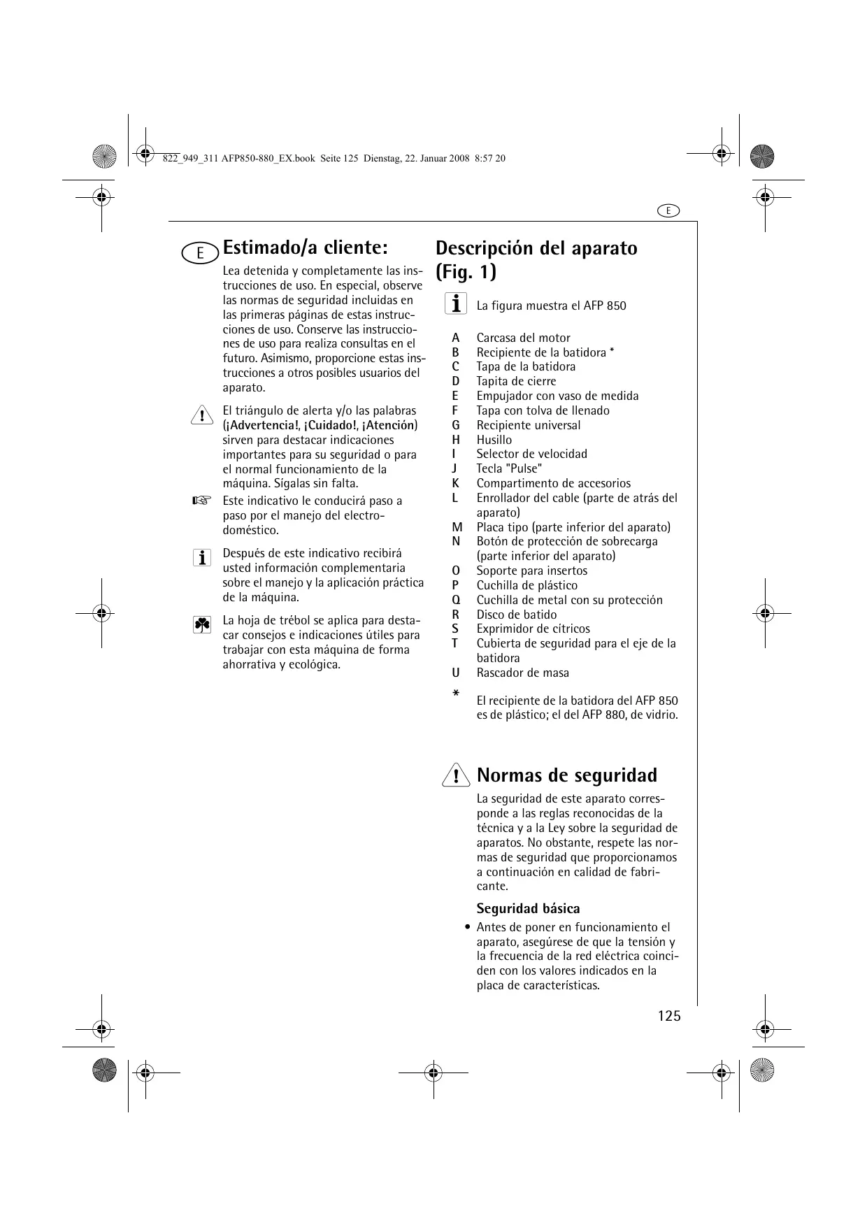 - Cuidado! La cucilla de metal (Fig 1/Q) está muyulfillada! Existe riesgo de lesión! Agarre la cucilla de metal solo por la empañadura y guardela siempre con su protección! Tenga cuidado al fregarla!