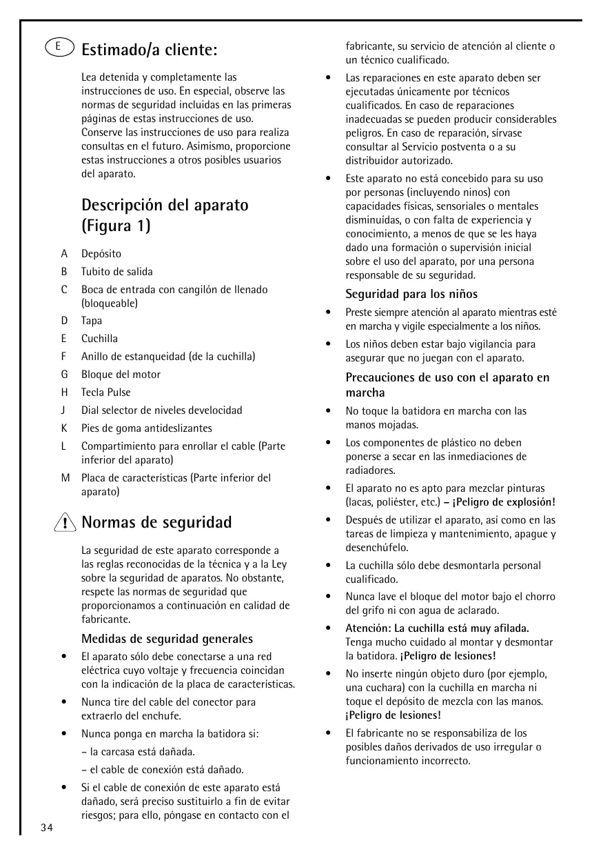 - No inse rte ningún obje to duro (por e je m pl una cuch ara) con l a cuch il a e n m arch a ni toq ue e lde pósito de m e zcl a con l as m anos. ¡Pe l igro de l e sione s!