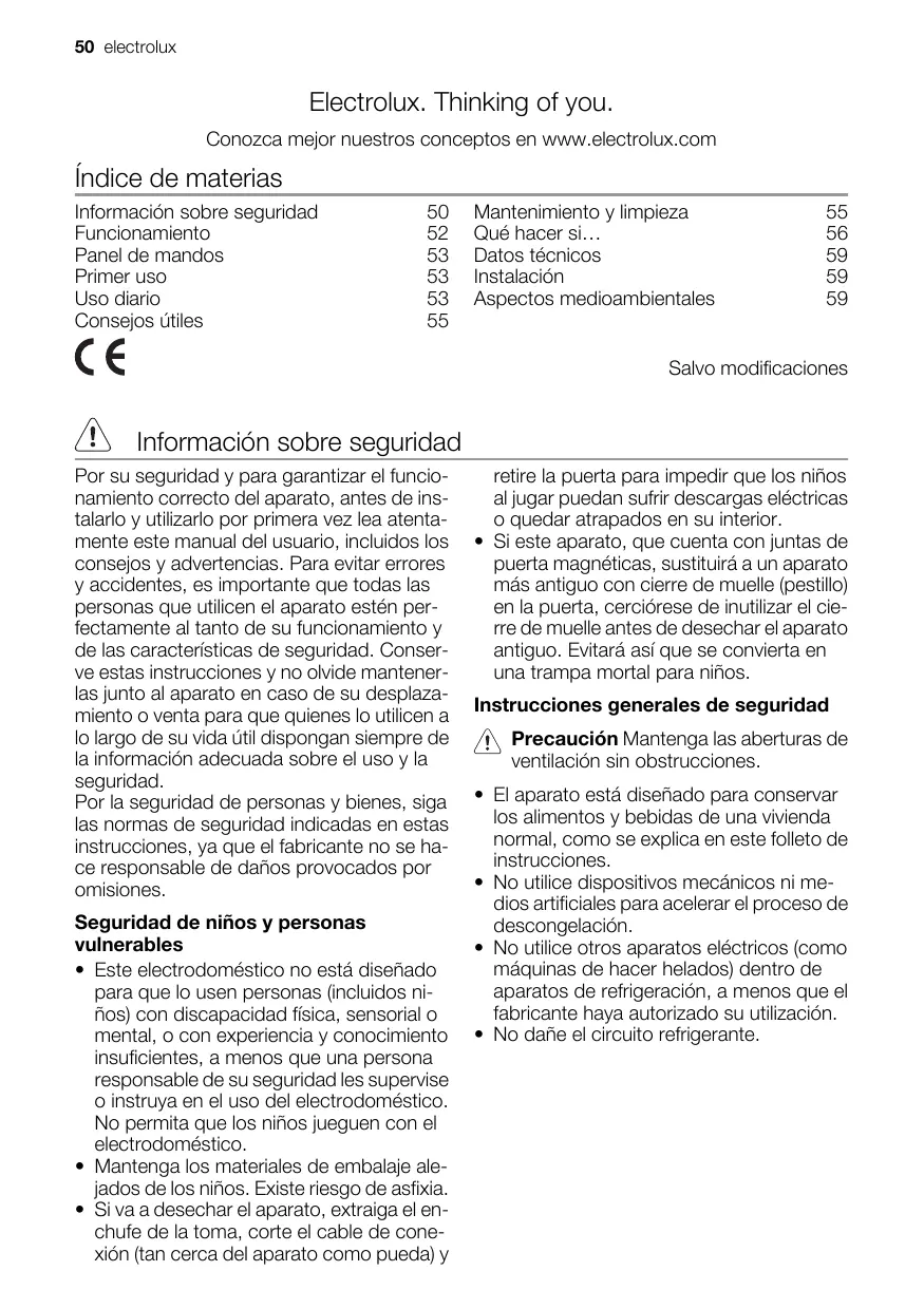 50 electrolux Electrolux. Thinking of you. Conozca mejor nuestros conceptos en www.electrolux.com indice de materias Informacién sobre seguridad 50 Funcionamiento 52 Panel de mandos 53 Primer uso 53 Uso diario 53 Consejos ütiles 55