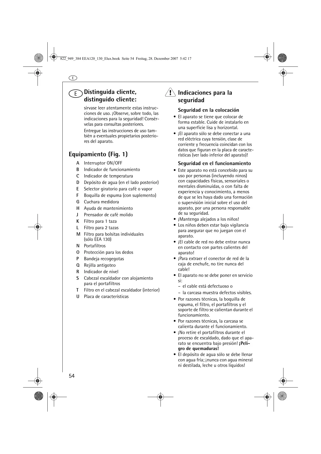 Interruptor ON/OFF Indicador de funcionamiento Indicador de temperatura Depósito de agua (en el lado posterior) Selector giratorio para café o vapor Boquilla de espuma (con suplemento) Cuchara medidora Ayuda de mantenimiento Prensador de café molido Filtro para 1 taza Filtro para 2 tazas Filtro para bolsitas individuales (sólo EEA 130) Portafiltros Protección para los dedos Bandeja recogegotas Rejilla antigoteo Indicador de nivel Cabezal escaldador con alojamiento para el portafiltros Filtro en el cabezal escaldador (interior) Placa de características 1 Indicaciones para la seguridad Seguridad en la colocación