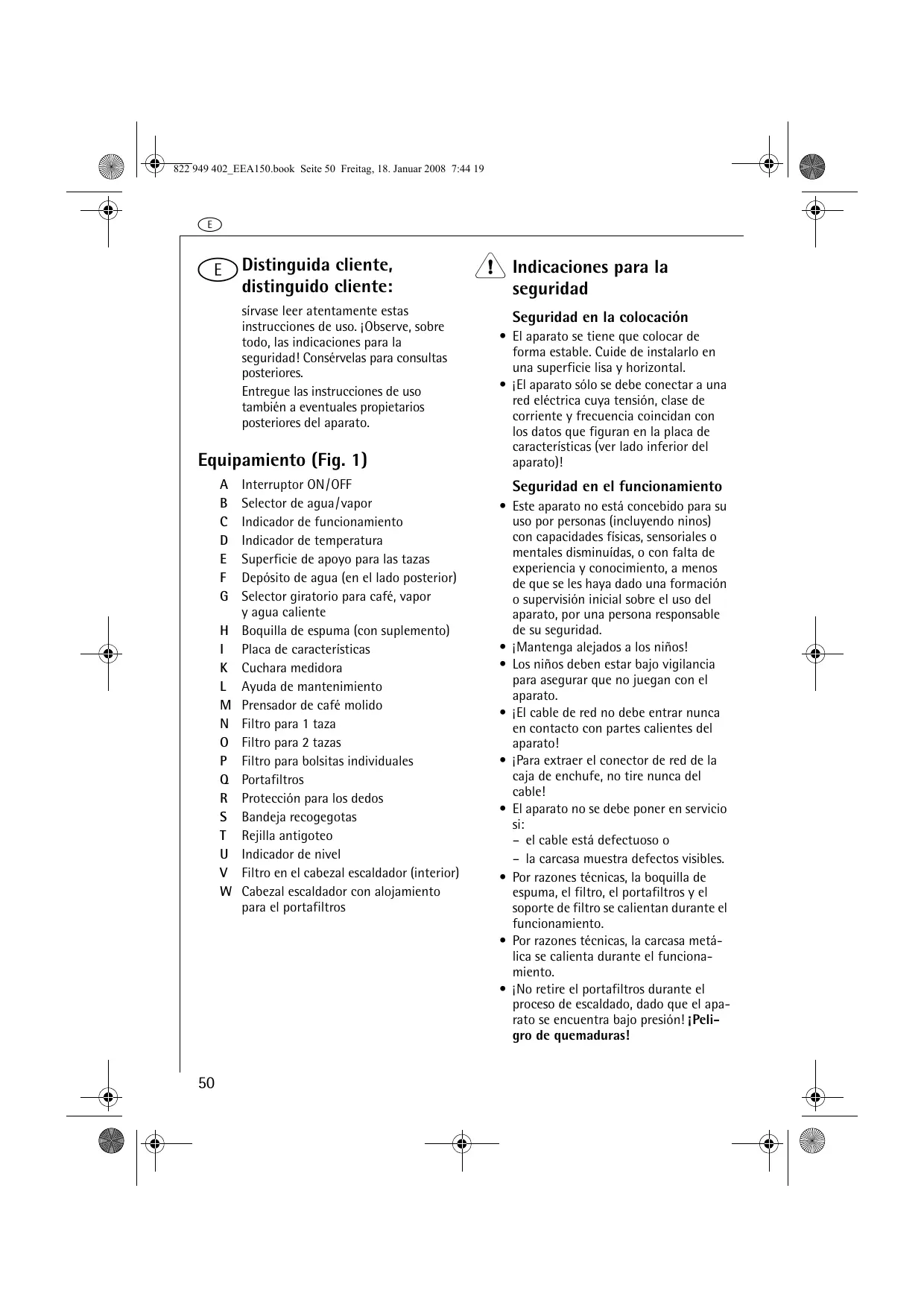 cliente, e Distinguida distinguido cliente: sírvase leer atentamente estas instrucciones de uso. ¡Observe, sobre todo, las indicaciones para la seguridad! Consérvelas para consultas posteriores. Entregue las instrucciones de uso también a eventuales propietarios posteriores del aparato. Interruptor ON/OFF Selector de agua/vapor Indicador de funcionamiento Indicador de temperatura Superficie de apoyo para las tazas Depósito de agua (en el lado posterior) Selector giratorio para café, vapor y agua caliente Boquilla de espuma (con suplemento) Placa de características Cuchara medidora Ayuda de mantenimiento Prensador de café molido Filtro para 1 taza Filtro para 2 tazas Filtro para bolsitas individuales Portafiltros Protección para los dedos Bandeja recogegotas Rejilla antigoteo Indicador de nivel Filtro en el cabezal escaldador (interior) Cabezal escaldador con alojamiento para el portafiltros 1 Indicaciones para la seguridad Seguridad en la colocación