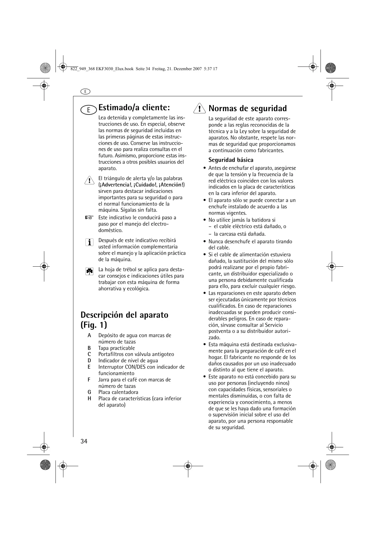 Depósito de agua con marcas de número de tazas Tapa practicable Portafiltros con válvula antigoteo Indicador de nivel de agua Interruptor CON/DES con indicador de funcionamiento Jarra para el café con marcas de número de tazas Placa calentadora Placa de características (cara inferior del aparato) 1 Normas de seguridad La seguridad de este aparato corresponde a las reglas reconocidas de la técnica y a la Ley sobre la seguridad de aparatos. No obstante, respete las normas de seguridad que proporcionamos a continuación como fabricantes. Seguridad básica