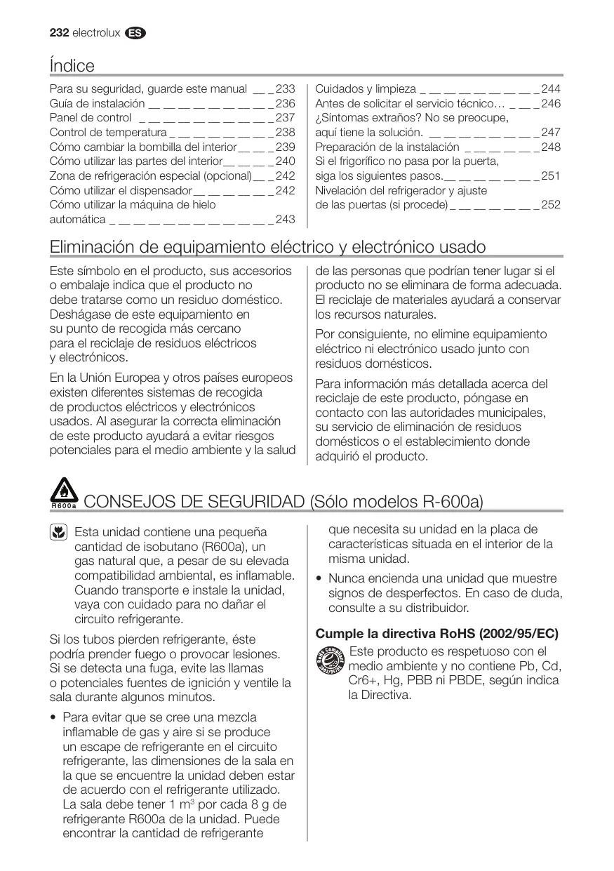 - Volte a verificar se existem fugas de água através do sistema de fornecimento de água (tubos, conectores e canos). Volte a colocar os tubos e não desloque o frigorífico. Conector Connector Tubo água Water da Tube Torneira Tap 232 electrolux ES Índice Para su seguridad, guarde este manual __ _ 233 Guía de instalación __ __ __ __ __ __ __ __ _ 236 Panel de control _ __ __ __ __ __ __ __ __ _ 237 Control de temperatura _ __ __ __ __ __ __ _ 238 Cómo cambiar la bombilla del interior __ __ _ 239 Cómo utilizar las partes del interior__ __ __ _ 240 Zona de refrigeración especial (opcional) __ _ 242 Cómo utilizar el dispensador__ __ __ __ __ _ 242 Cómo utilizar la máquina de hielo automática _ __ __ __ __ __ __ __ __ __ __ _ 243 Cuidados y limpieza _ __ __ __ __ __ __ __ _ 244 Antes de solicitar el servicio técnico… _ __ _ 246 ¿Síntomas extraños? No se preocupe, aquí tiene la solución. __ __ __ __ __ __ __ _ 247 Preparación de la instalación _ __ __ __ __ _ 248 Si el frigorífico no pasa por la puerta, siga los siguientes pasos.__ __ __ __ __ __ _ 251 Nivelación del refrigerador y ajuste de las puertas (si procede) _ __ __ __ __ __ _ 252 Eliminación de equipamiento eléctrico y electrónico usado Este símbolo en el producto, sus accesorios o embalaje indica que el producto no debe tratarse como un residuo doméstico. Deshágase de este equipamiento en su punto de recogida más cercano para el reciclaje de residuos eléctricos y electrónicos. de las personas que podrían tener lugar si el producto no se eliminara de forma adecuada. El reciclaje de materiales ayudará a conservar los recursos naturales. En la Unión Europea y otros países europeos existen diferentes sistemas de recogida de productos eléctricos y electrónicos usados. Al asegurar la correcta eliminación de este producto ayudará a evitar riesgos potenciales para el medio ambiente y la salud Para información más detallada acerca del reciclaje de este producto, póngase en contacto con las autoridades municipales, su servicio de eliminación de residuos domésticos o el establecimiento donde adquirió el producto. Por consiguiente, no elimine equipamiento eléctrico ni electrónico usado junto con residuos domésticos. CONSEJOS DE SEGURIDAD (Sólo modelos R-600a) Esta unidad contiene una pequeña cantidad de isobutano (R600a), un gas natural que, a pesar de su elevada compatibilidad ambiental, es inflamable. Cuando transporte e instale la unidad, vaya con cuidado para no dañar el circuito refrigerante. Si los tubos pierden refrigerante, éste podría prender fuego o provocar lesiones. Si se detecta una fuga, evite las llamas o potenciales fuentes de ignición y ventile la sala durante algunos minutos.