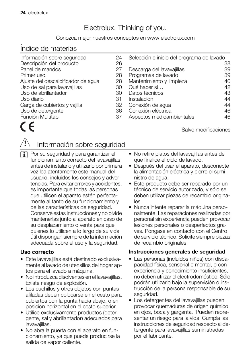 24 electrolux Electrolux. Thinking of you. Conozca mejor nuestros conceptos en www.electrolux.com indice de materias Informacién sobre seguridad 24 Descripcién del producto 26 Panel de mandos 27 Primer uso 28 Ajuste del descalcificador de agua 28 Uso de sal para lavavaiillas 30 Uso de abrilantador 30 Uso diario 31 Carga de cubiertos y vajilla 32 Uso de detergente 36 Funcién Multitab 37