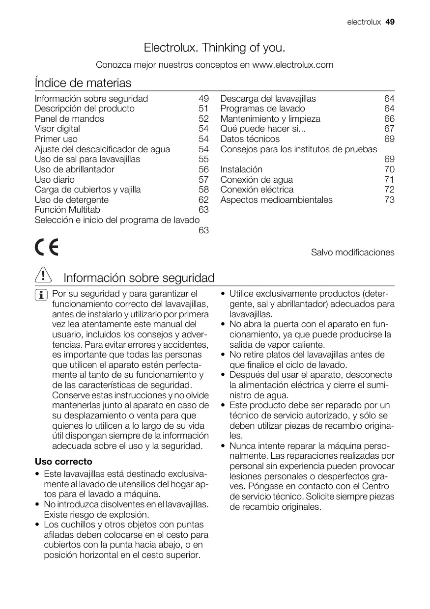 electrolux 49 Electrolux. Thinking of you. Conozca mejor nuestros conceptos en www.electrolux.com indice de materias Informacién sobre seguridad 49 Descripcién del producto 51 Panel de mandos 52 Visor digital 54 Primer uso 54 Ajuste del descalcificador de agua 54 Uso de sal para lavavaiillas 55 Uso de abrilantador 56 Uso diario 57 Carga de cubiertos y vajilla 58 Uso de detergente 62 Funcién Multitab 63 Seleccién e inicio del programa de lavado ce 63 2 Informaciôn sobre seguridad Descarga del lavavaïjillas 64 Programas de lavado 64 Mantenimiento y limpieza 66 Qué puede hacer si... 67 Datos técnicos 69 Consejos para los institutos de pruebas