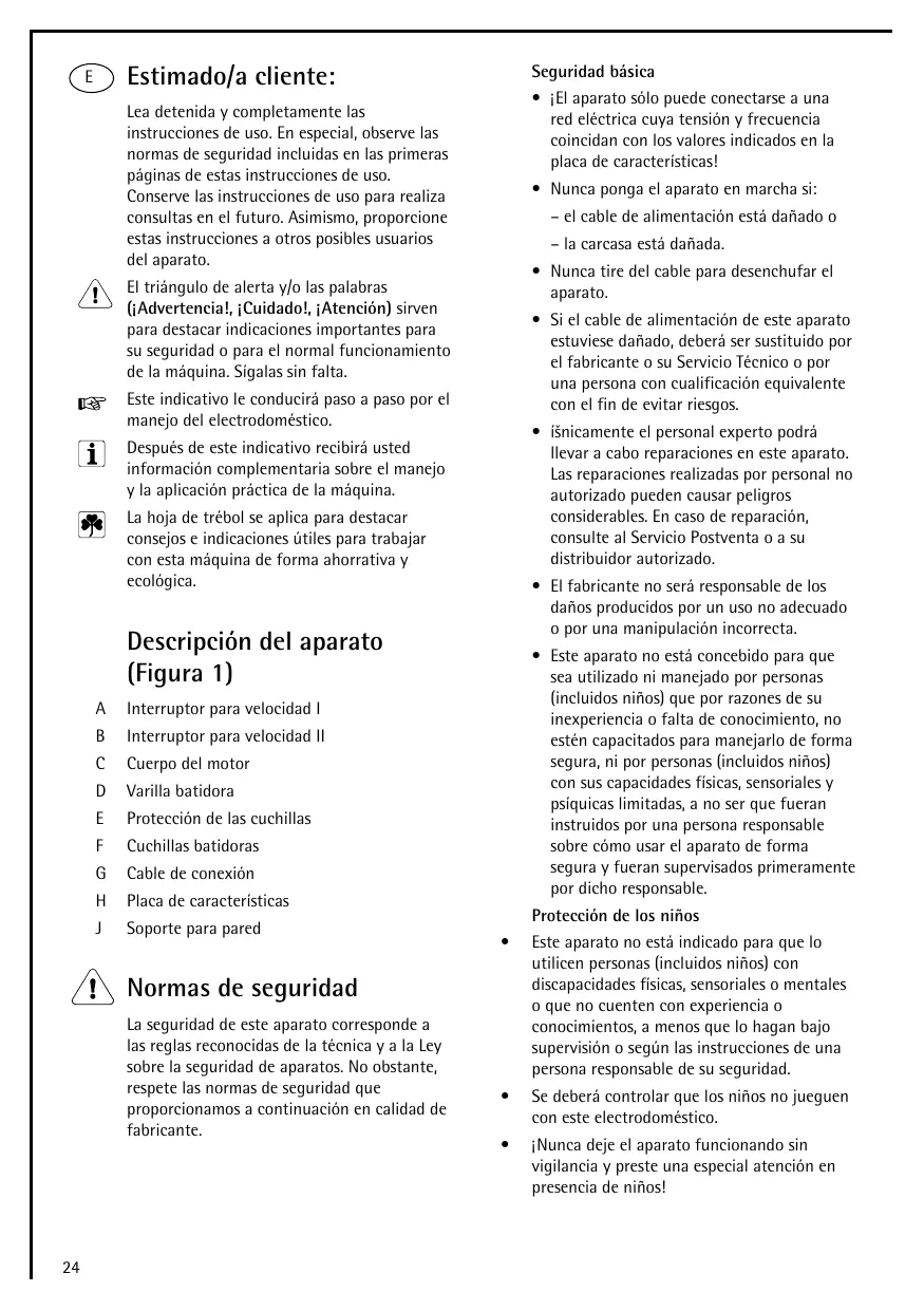 Le a de te nida y com pl e tam e nte l instruccione s de uso. En e spe cial , obse rve l norm as de se guridad incl uidas e n l as prim e ras páginas de e stas instruccione s de uso. Conse rve l as instruccione s de uso para re al iza consul tas e n e lfuturo. Asim ism o, proporcione e stas instruccione s a otros posibl e s usuarios de laparato. Eltriángul o de al e rta y/o l as pal abras (¡Adve rte ncia!, ¡Cuidado!, ¡Ate nción) sirve n para de stacar indicacione s im portante s para su se guridad o para e lnorm alfuncionam ie nto de l a m áq uina. Sígal as sin fal ta. Este indicativo l e conducirá paso a paso por e l m ane jo de le l e ctrodom éstico. D e spués de e ste indicativo re cibirá uste d inform ación com pl e m e ntaria sobre e lm ane jo a apl icación práctica de l a m áq uina. La h oja de trébolse apl ica para de stacar conse jos e indicacione s útil e s para trabajar con e sta m áq uina de form a ah orrativa y e col ógica. Cue rpo de lm otor