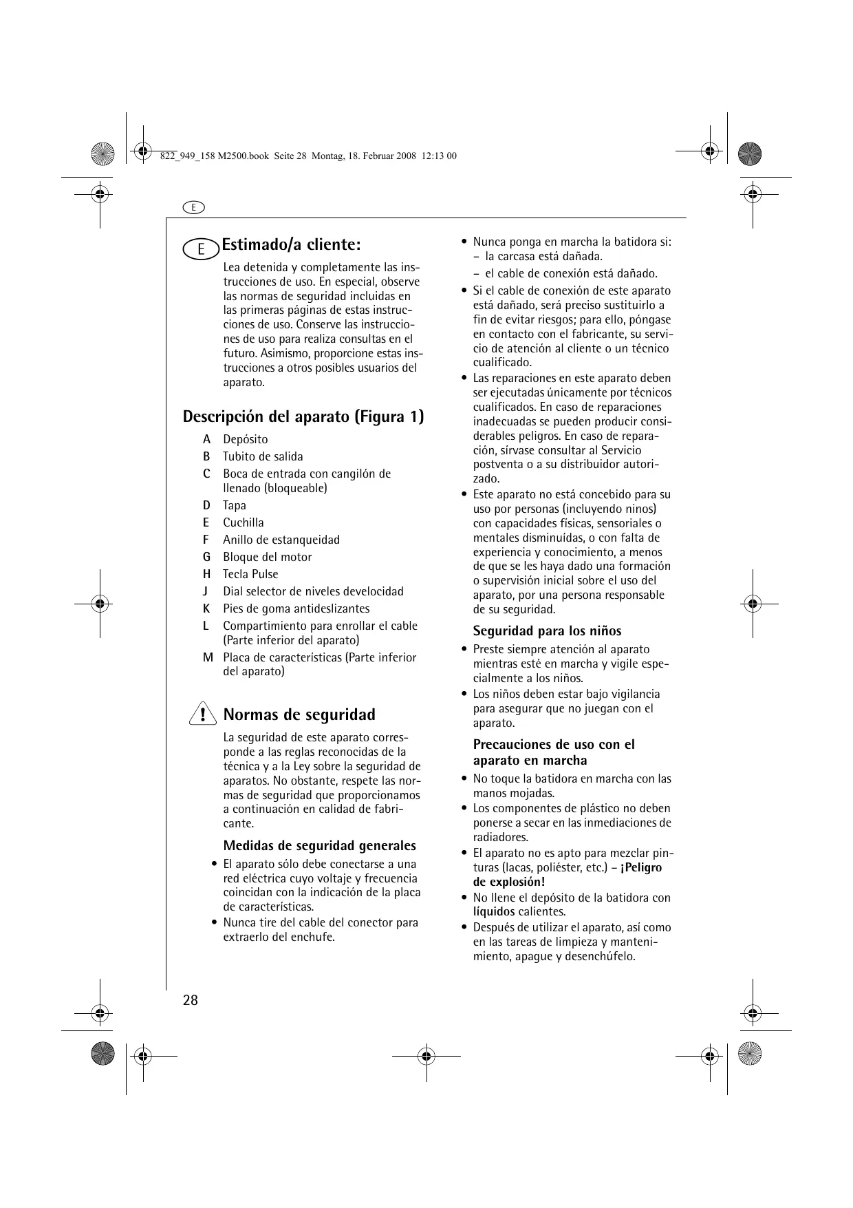 eEstimado/a cliente: Lea detenida y completamente las instrucciones de uso. En especial, observe las normas de seguridad incluidas en las primeras páginas de estas instrucciones de uso. Conserve las instrucciones de uso para realiza consultas en el futuro. Asimismo, proporcione estas instrucciones a otros posibles usuarios del aparato. Descripción del aparato (Figura 1) A Depósito B Tubito de salida C Boca de entrada con cangilón de llenado (bloqueable) D Tapa E Cuchilla F Anillo de estanqueidad G Bloque del motor H Tecla Pulse J Dial selector de niveles develocidad K Pies de goma antideslizantes L Compartimiento para enrollar el cable (Parte inferior del aparato) M Placa de características (Parte inferior del aparato) 1 Normas de seguridad La seguridad de este aparato corresponde a las reglas reconocidas de la técnica y a la Ley sobre la seguridad de aparatos. No obstante, respete las normas de seguridad que proporcionamos a continuación en calidad de fabricante. Medidas de seguridad generales