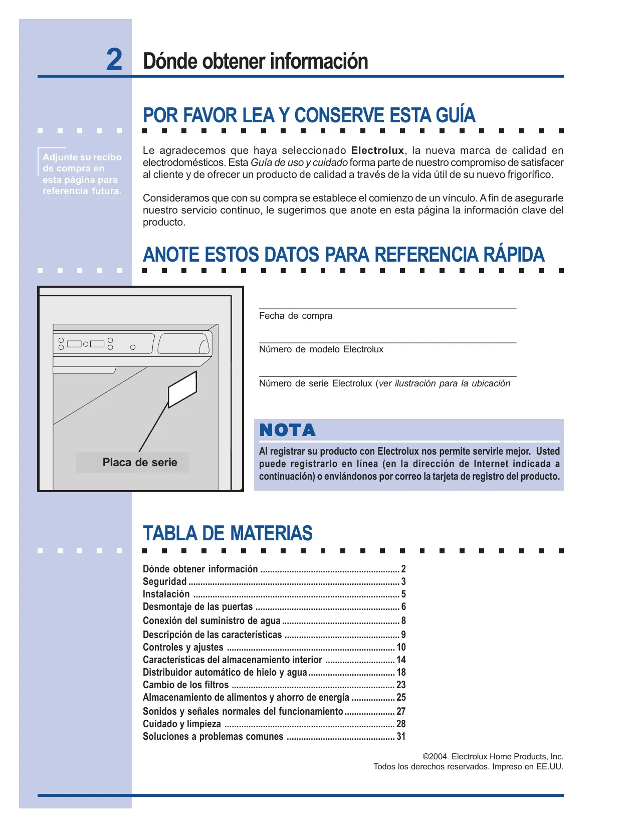 Los indicadores + El sistema de control electrônico * Liame a su representante de servicio Electrolux, quien digitales de ha detectado un problema de puede interpretar cualquier mensaje o cédigos numéricos. temperatura estän rendimiento. que destellen en los indicadores digitales. Raccordement à l'alimentation en eal Résumé des caractéristiques Commandes et réglages Caractéristiques de rangement. Distributeur automatique d’eau et de glaçons . Changement du filtre Conservation des a g Bruits et éléments visuels d'un fonctionnement norma Entretien et nettoyage …… Solutions de problèmes simple: