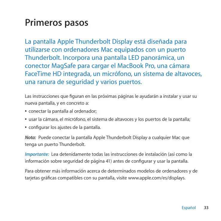 Français Primeros pasos La pantalla Apple Thunderbolt Display está diseñada para utilizarse con ordenadores Mac equipados con un puerto Thunderbolt. Incorpora una pantalla LED panorámica, un conector MagSafe para cargar el MacBook Pro, una cámara FaceTime HD integrada, un micrófono, un sistema de altavoces, una ranura de seguridad y varios puertos. Las instrucciones que figuran en las próximas páginas le ayudarán a instalar y usar su nueva pantalla, y en concreto a: ÂÂ conectar la pantalla al ordenador; ÂÂ usar la cámara, el micrófono, el sistema de altavoces y los puertos de la pantalla; ÂÂ configurar los ajustes de la pantalla. Nota: Puede conectar la pantalla Apple Thunderbolt Display a cualquier Mac que tenga un puerto Thunderbolt. Importante: Lea detenidamente todas las instrucciones de instalación (así como la información sobre seguridad de página 41) antes de configurar y usar la pantalla. Para obtener más información acerca de determinados modelos de ordenadores y de tarjetas gráficas compatibles con su pantalla, visite www.apple.com/es/displays. Español